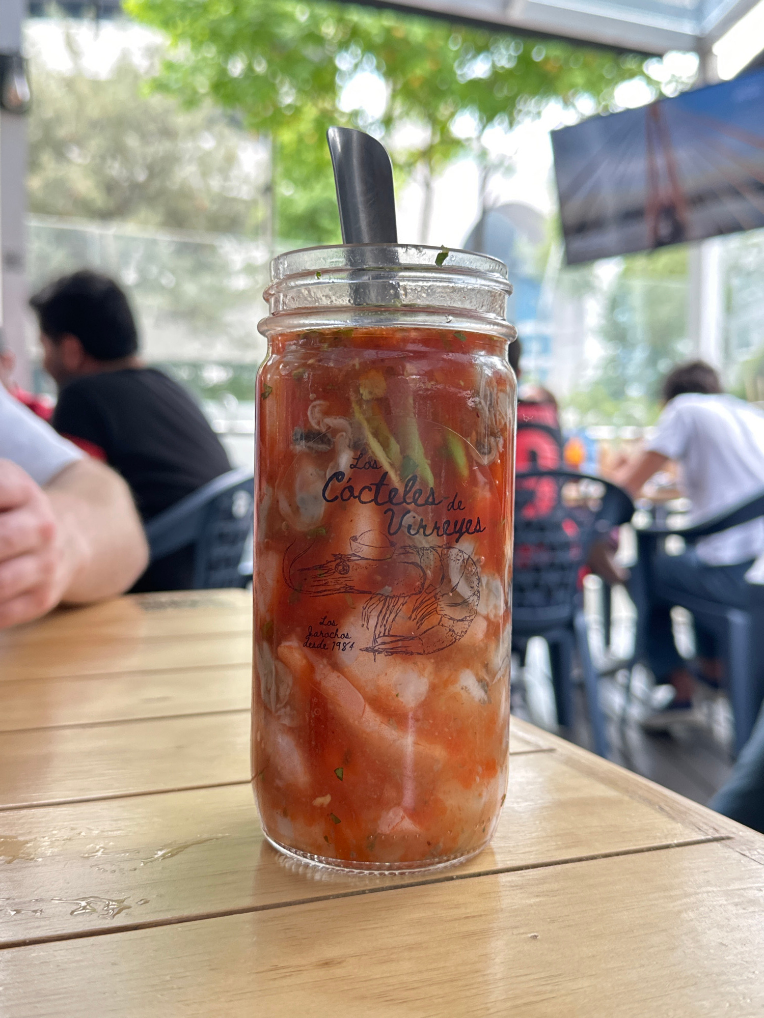A glass jar filled with a red, viscous substance, possibly a cocktail, rests on a light-brown wooden table. A silver spoon is inserted into the jar. The jar is labeled "Los Cacteles de Virreyes," and…read more