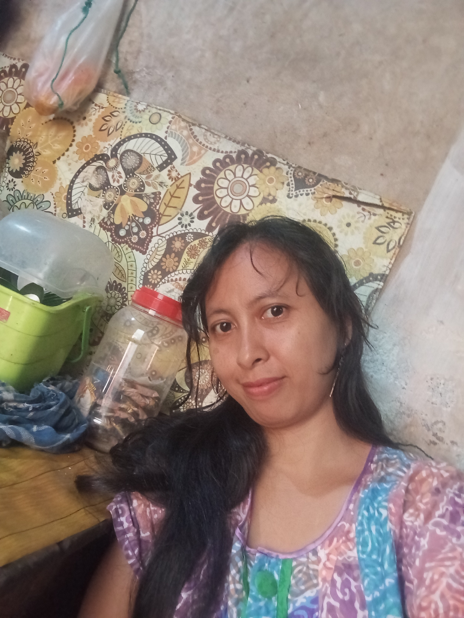 A woman with long, dark hair is lying on a patterned mat, likely indoors, in Baron, Indonesia. She is wearing a colorful floral top. Beside her on the mat are a clear plastic jar with a red lid, a gre…read more