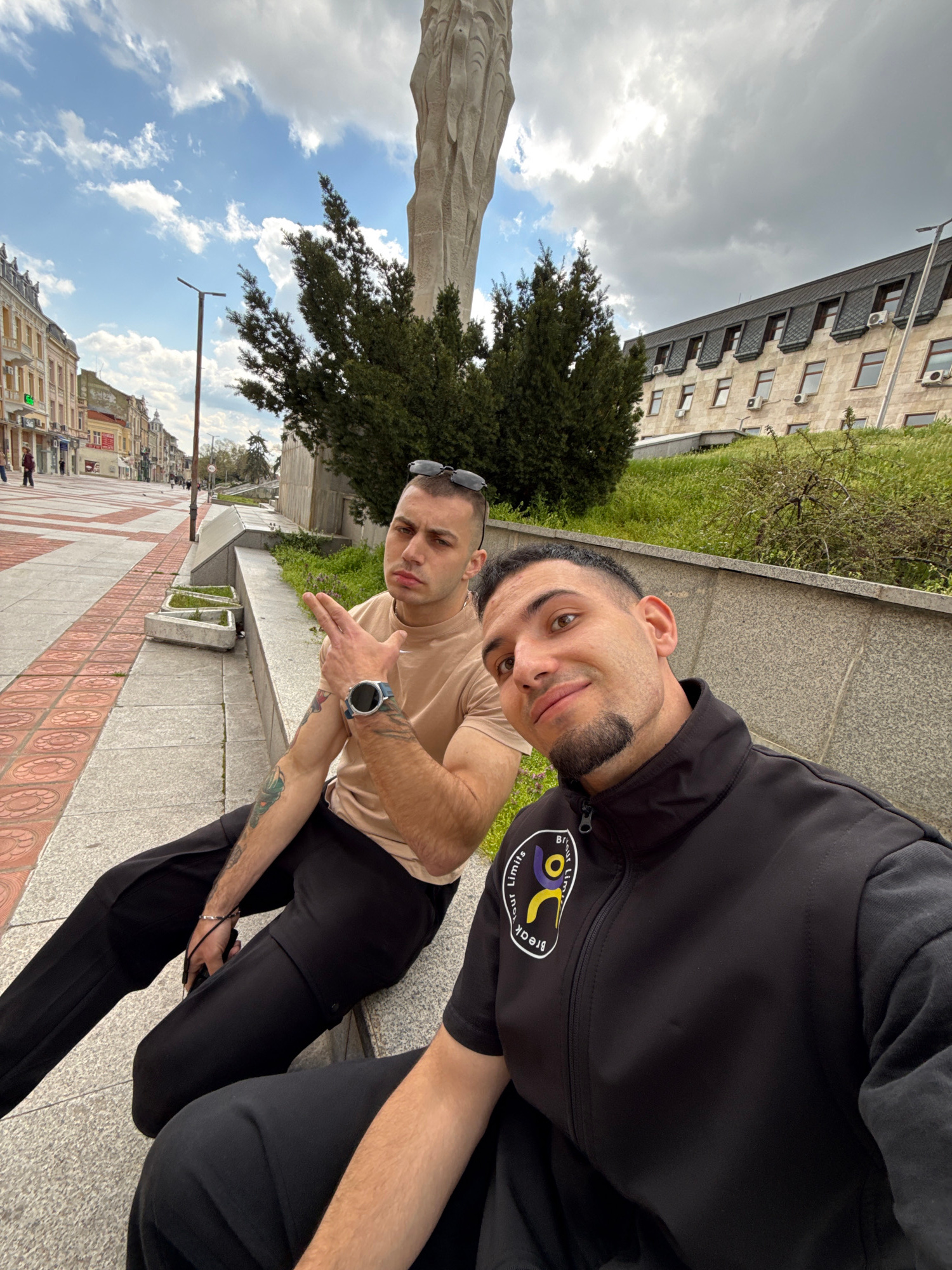 Two young men are posing for a selfie in front of the Monument to 1300 Years of Bulgaria in Shumen, Bulgaria. The monument is partially visible on the left, with a tree in front of it. The men are sit…read more
