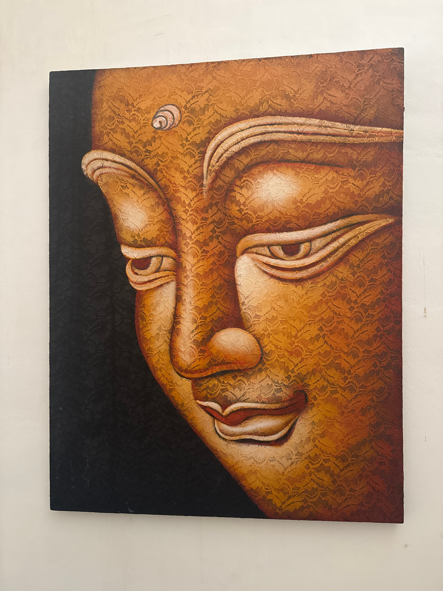 The image shows an oil painting of a reclining Buddha head against a dark background. The head is adorned with an ornate lace pattern. The picture hangs on a white wall, with the composition tightly cā¦read more