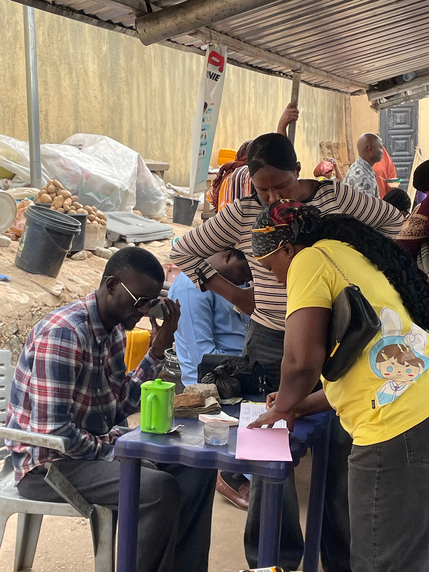 A group of people are gathered around a table outdoors, likely at a polling station in Bukuru, Nigeria. One man, wearing a plaid shirt and glasses, is seated at the table and appears to be interacting…read more