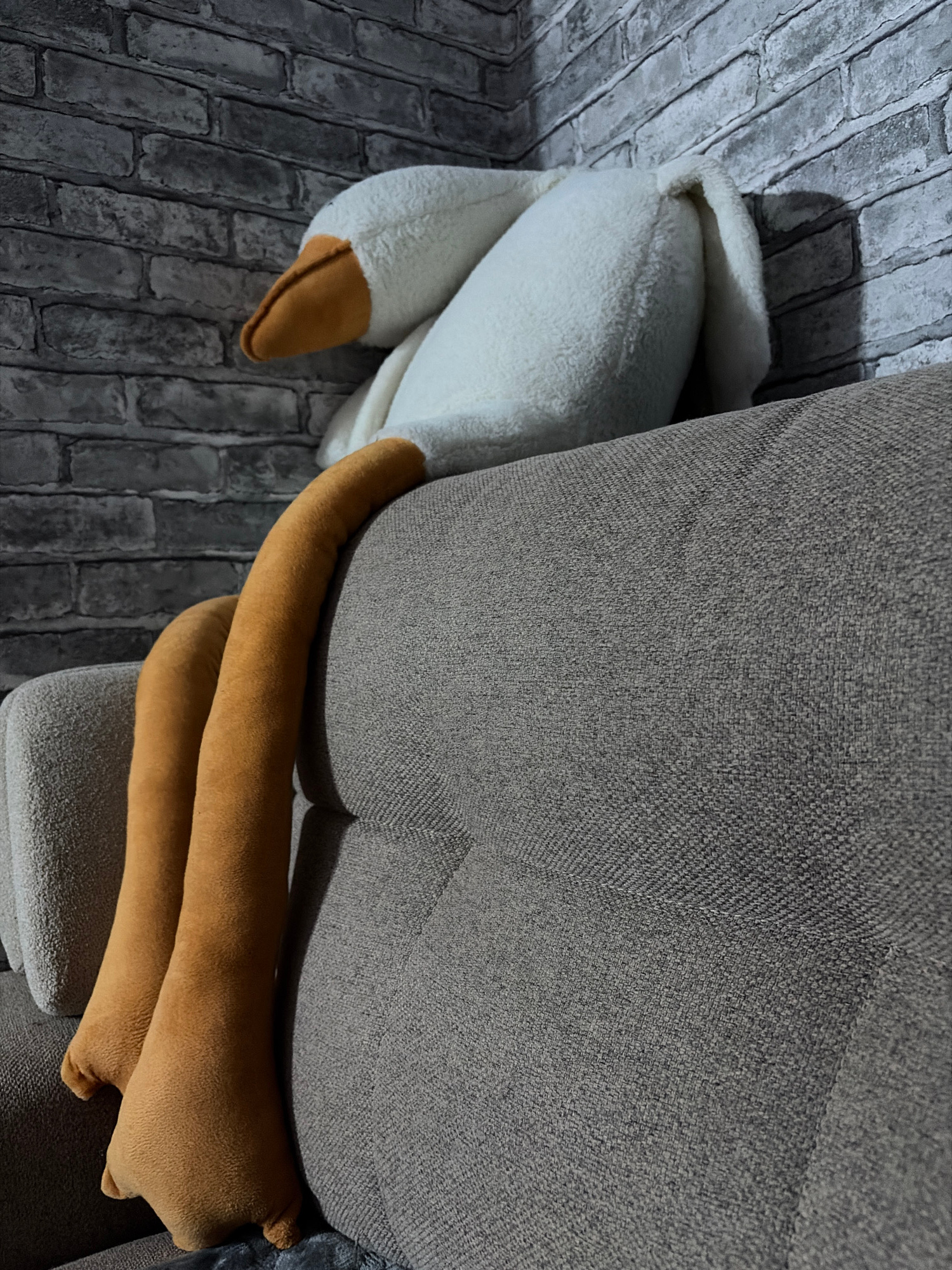 The image shows a stuffed swan toy partially wedged between a grey brick wall and a grey fabric-covered couch. The swan is primarily white with brown beak and feet. The scene provides no information a…read more
