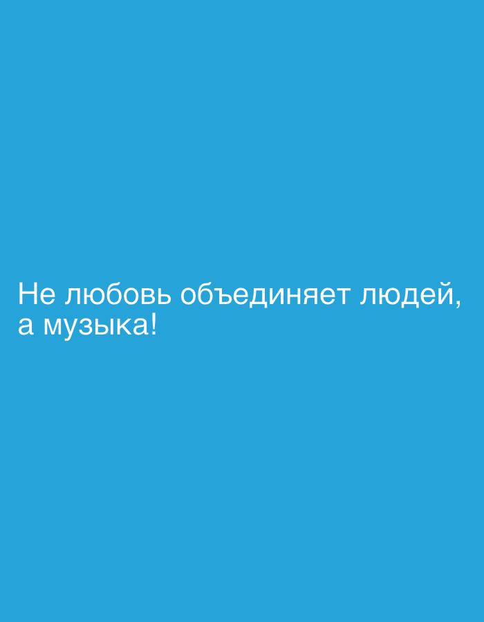 The image is a light blue background with white text in Russian that reads "Not love unites people, but music!".