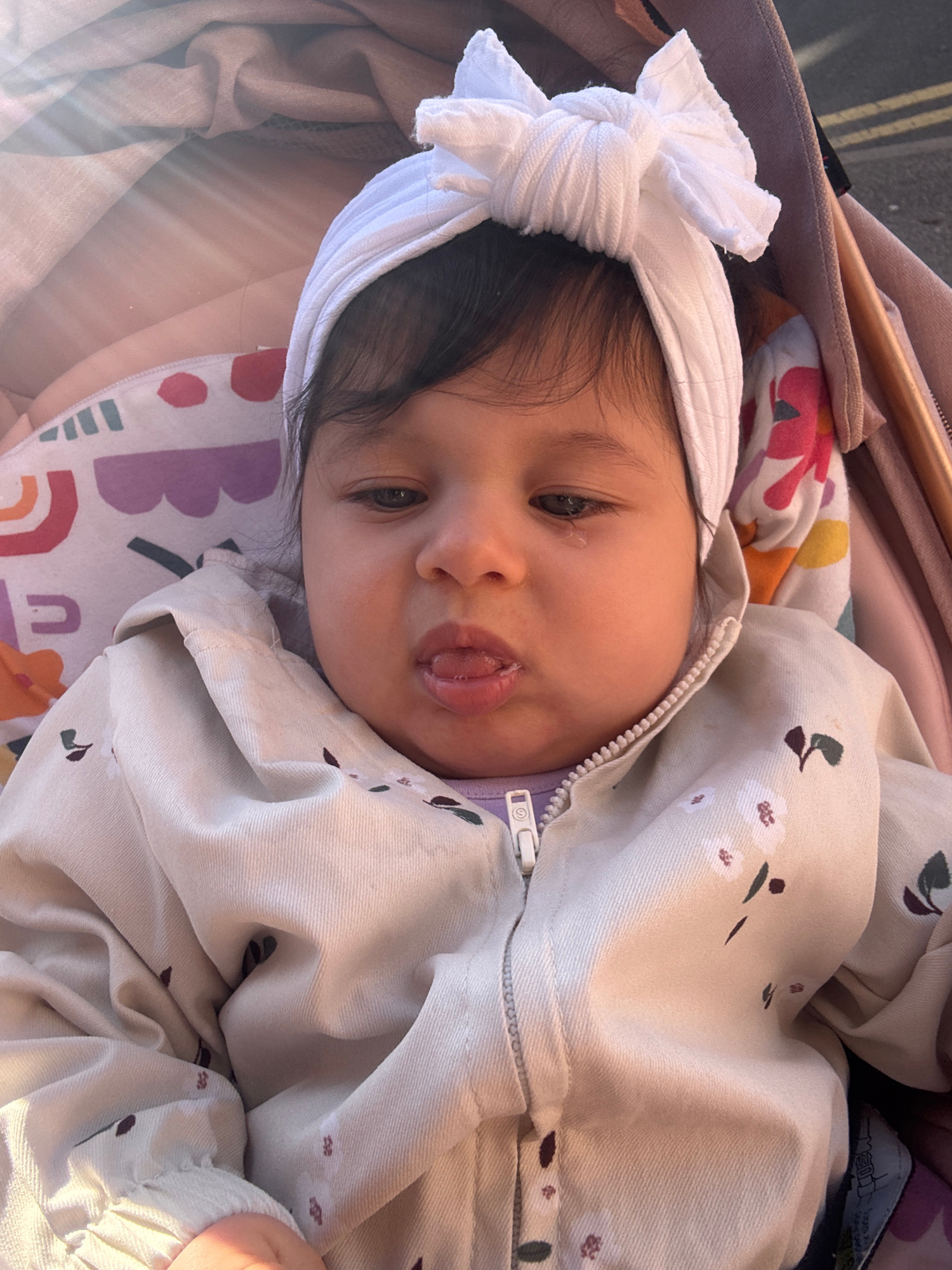 A close-up shot depicts a baby lying in a stroller, the baby is wearing a white headband with a bow. The baby has dark hair and is wearing a beige jacket with a floral pattern. The baby's face is slig…read more