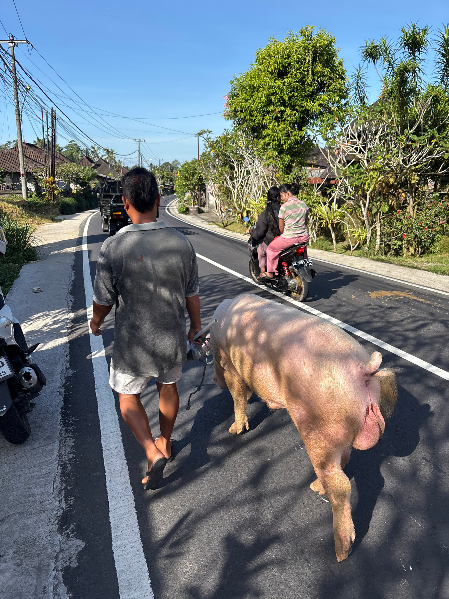 A man walks on the side of a road pulling a pig by a rope. The road is dark asphalt with painted white lines. The pig appears to be alive. Another person is sitting on a motorbike behind them. The loc…read more