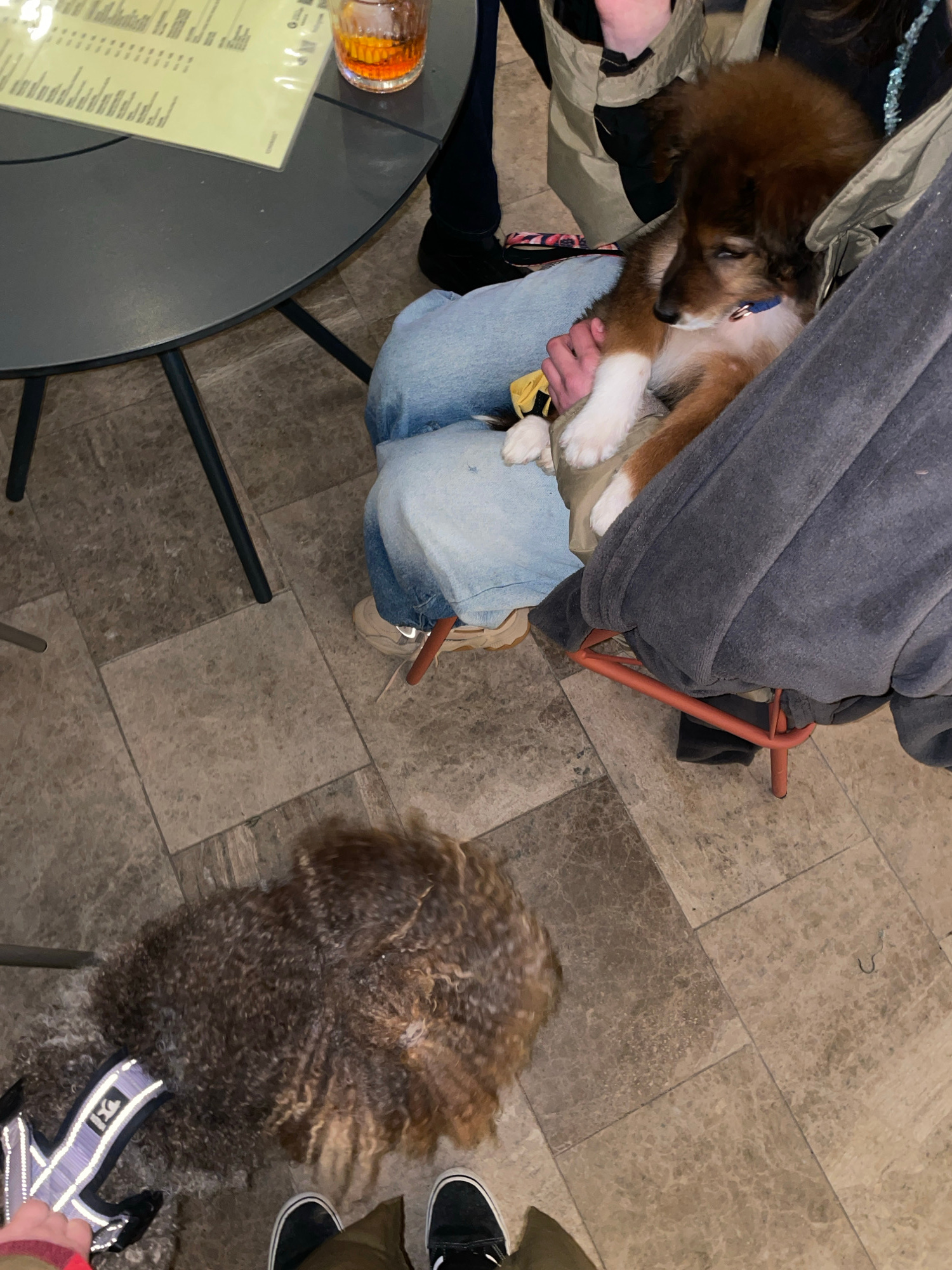 A high-angle shot shows an indoor scene at what appears to be a restaurant or bar. The floor is tiled. A young brown-and-white puppy with a blue collar is being held in a person's lap. The person is w…read more