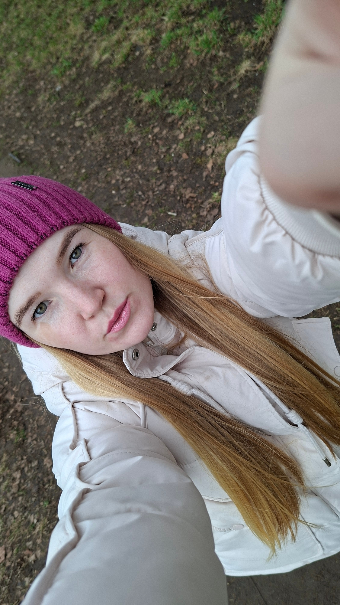 A woman is taking a selfie outdoors. She is wearing a pink knit hat and a light beige puffer jacket. Her long blonde hair is parted in the middle and falls down over her jacket. The background consist…read more