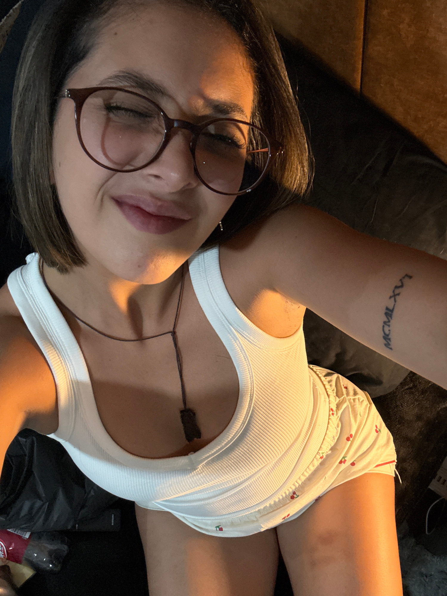 A woman wearing round eyeglasses and a white tank top is lying down. She has a tattoo on her left arm. She is wearing shorts with a cherry pattern. A water bottle is on the right side of the image. Th…read more