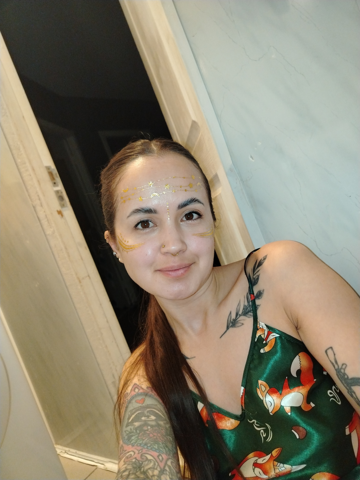 A medium shot captures a woman taking a selfie indoors. She has long, dark brown hair pulled back, and her face is adorned with golden temporary tattoos, featuring stars, moons, and decorative lines oβ¦read more