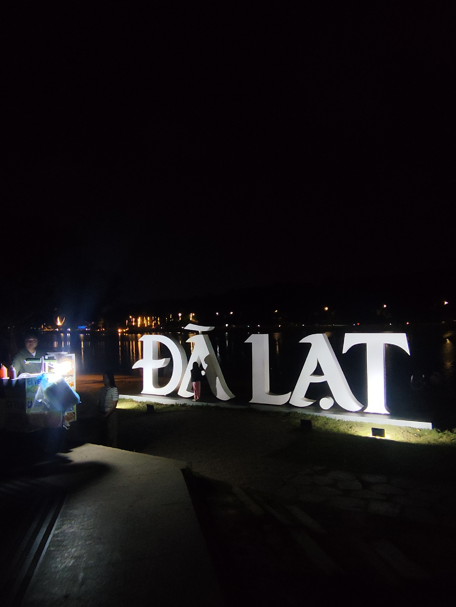 At night in Da Lat, Vietnam, a large, illuminated "ĐÀ LẠT" sign stands on a grassy area near a body of water. A person is positioned near the "A" of the sign. A food vendor cart is visible to the left…read more