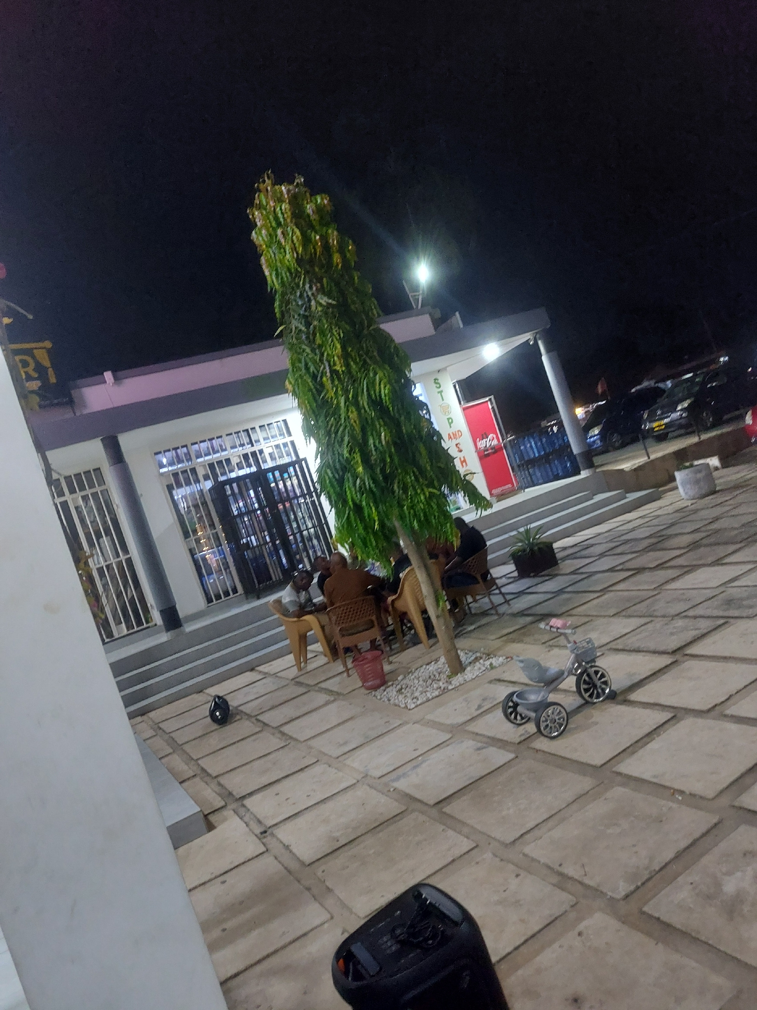 Captured at night in Dar es-Salaam, Tanzania, the image shows a partially visible building with multiple lit windows, likely a restaurant or commercial establishment. The building is adorned with a Co…read more