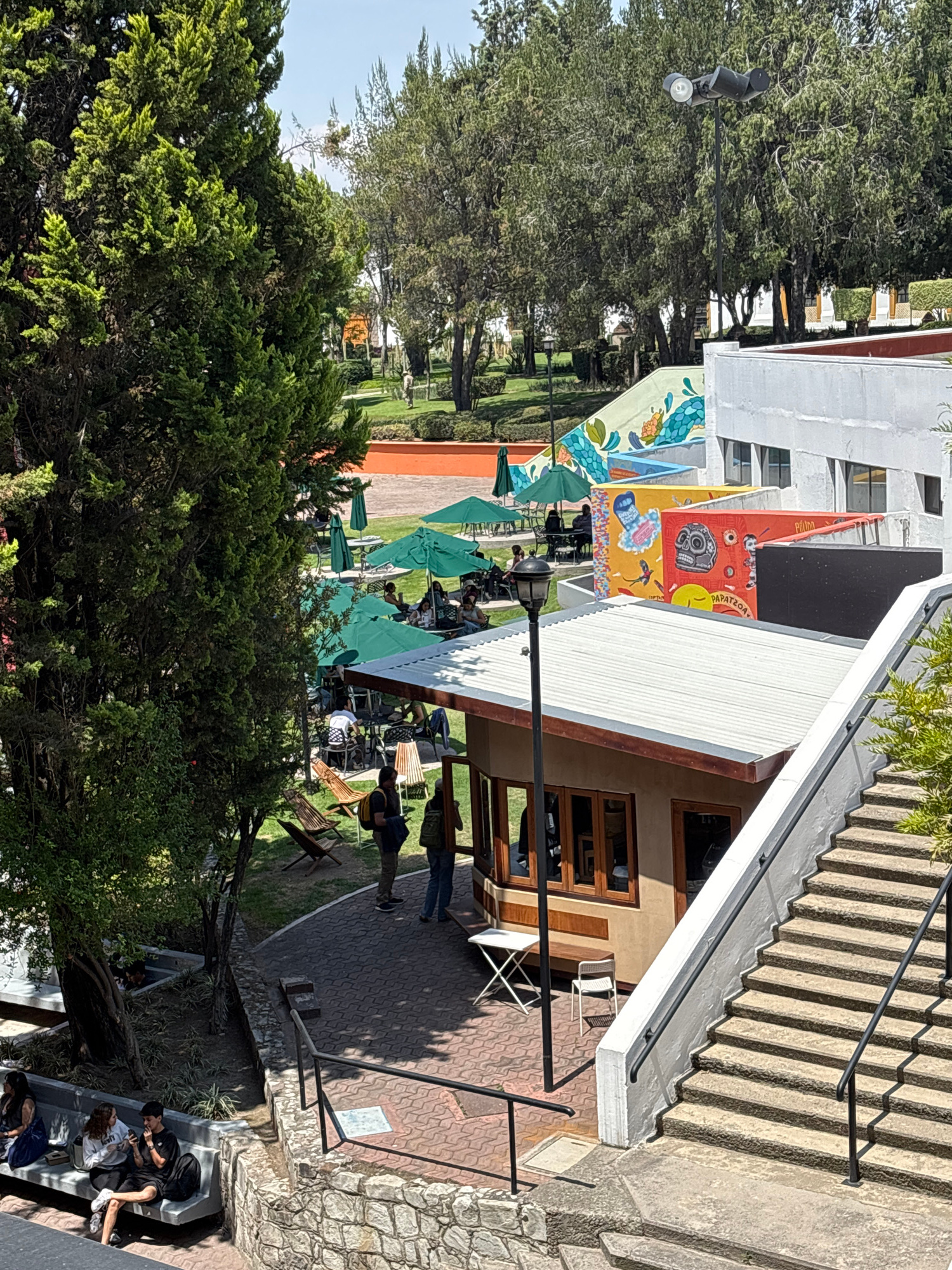 This vibrant outdoor scene captures a lively public space, likely a cafe patio or communal area, under bright midday sunlight. The clear weather illuminates an inviting setting with strong shadows. I…read more
