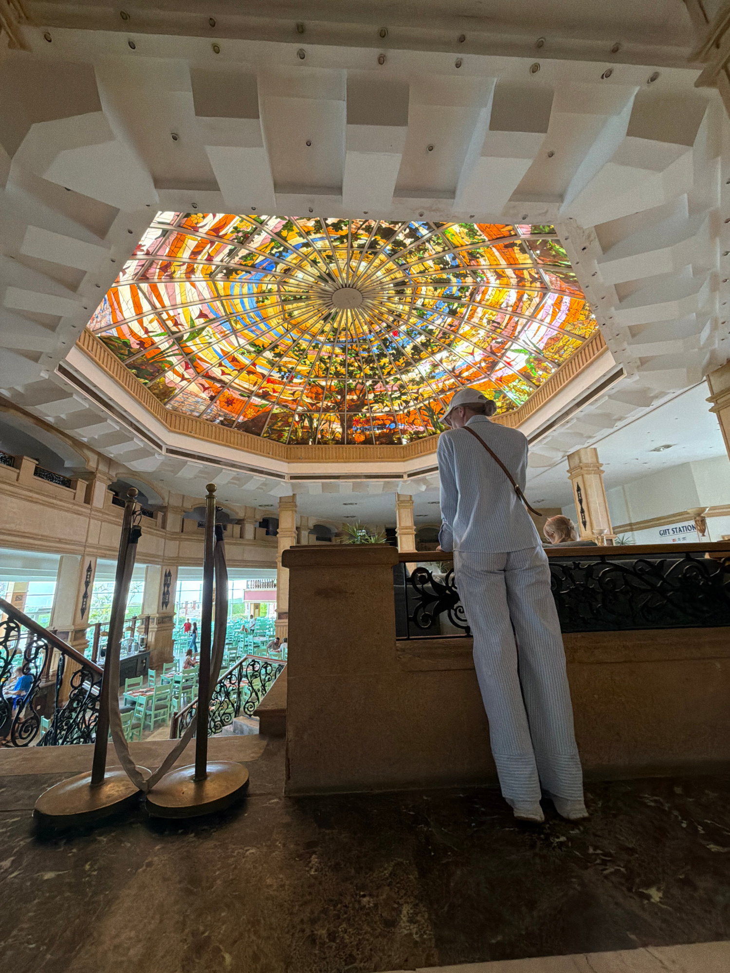 The image shows the interior of a building with a large, ornate stained glass dome. The dome features a vibrant circular design with various colors and patterns, illuminated by natural light. A person…read more