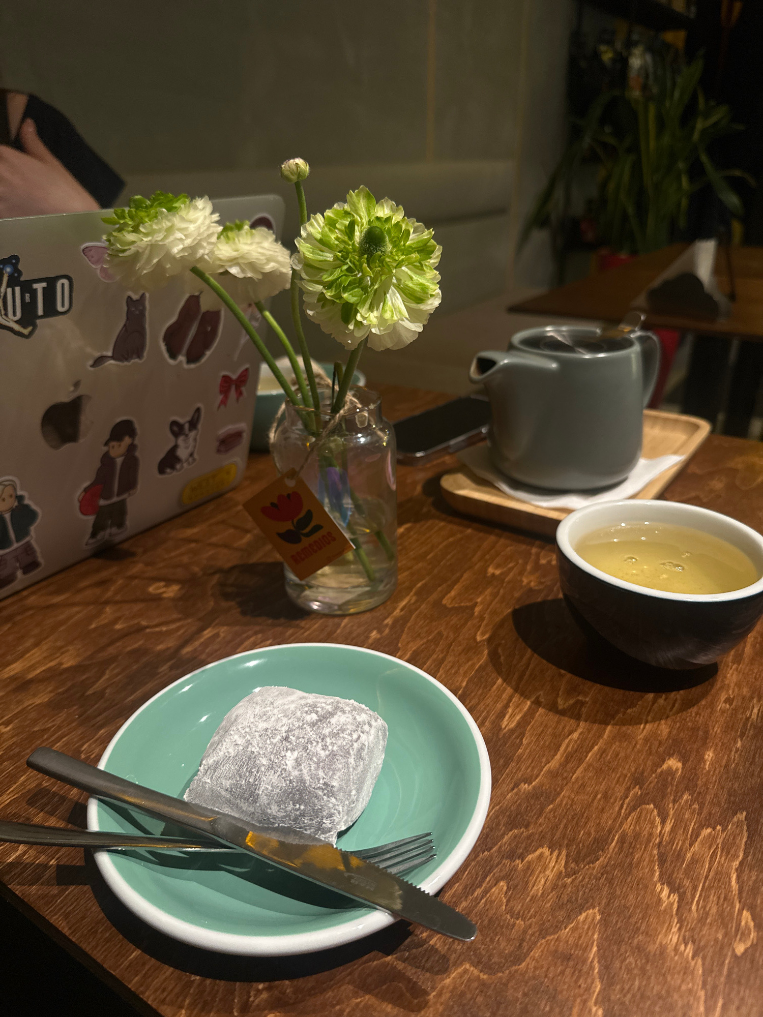 A still-life photograph captures a table setting, likely in a cafe or restaurant. The scene includes a laptop adorned with stickers, a small vase with white and green flowers, a light green plate with…read more