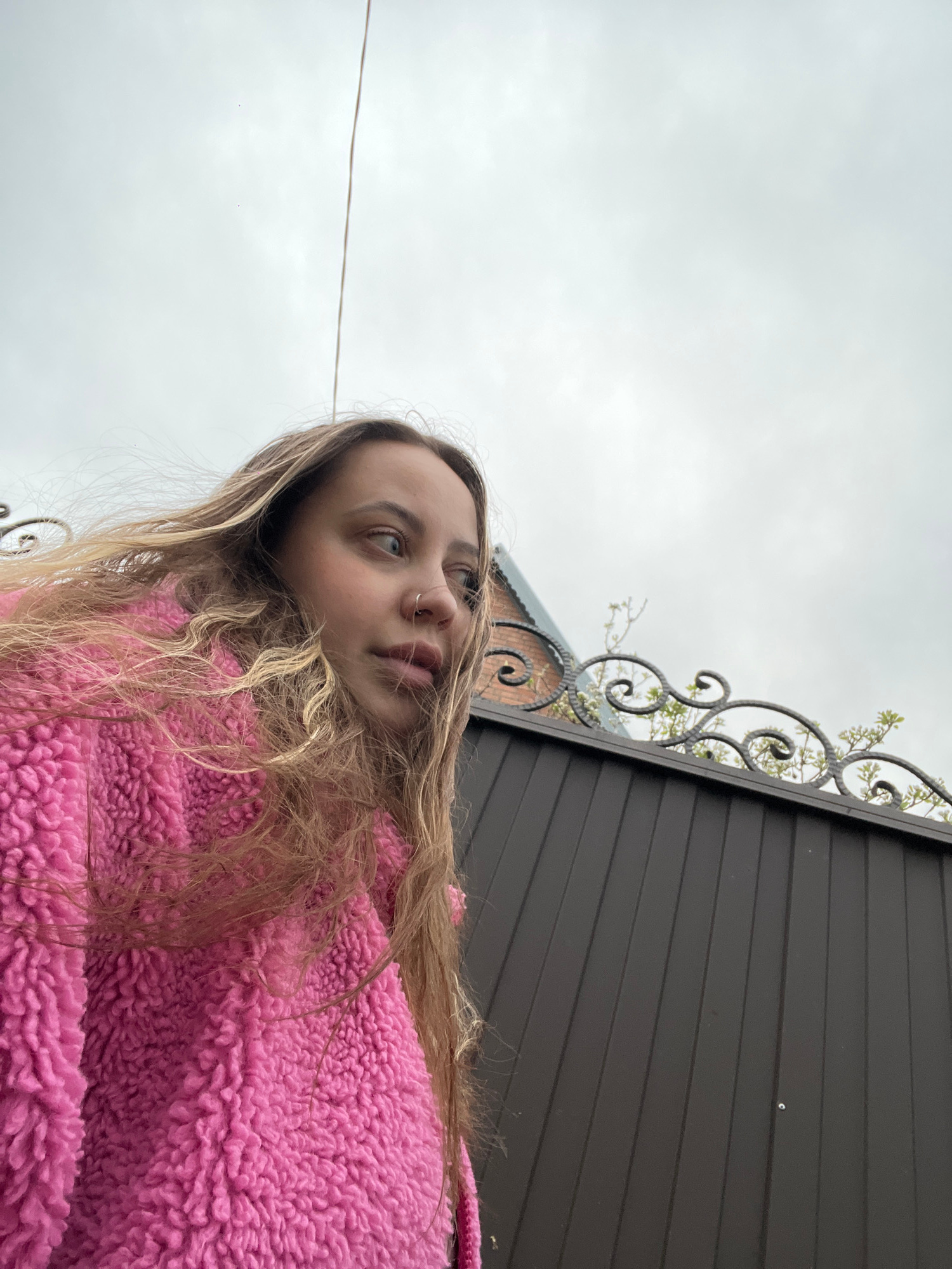 The image features a young woman wearing a pink, fluffy jacket, angled upwards towards the sky. The background includes a cloudy sky, a portion of a dark brown wooden fence, and a wrought iron decorat…read more