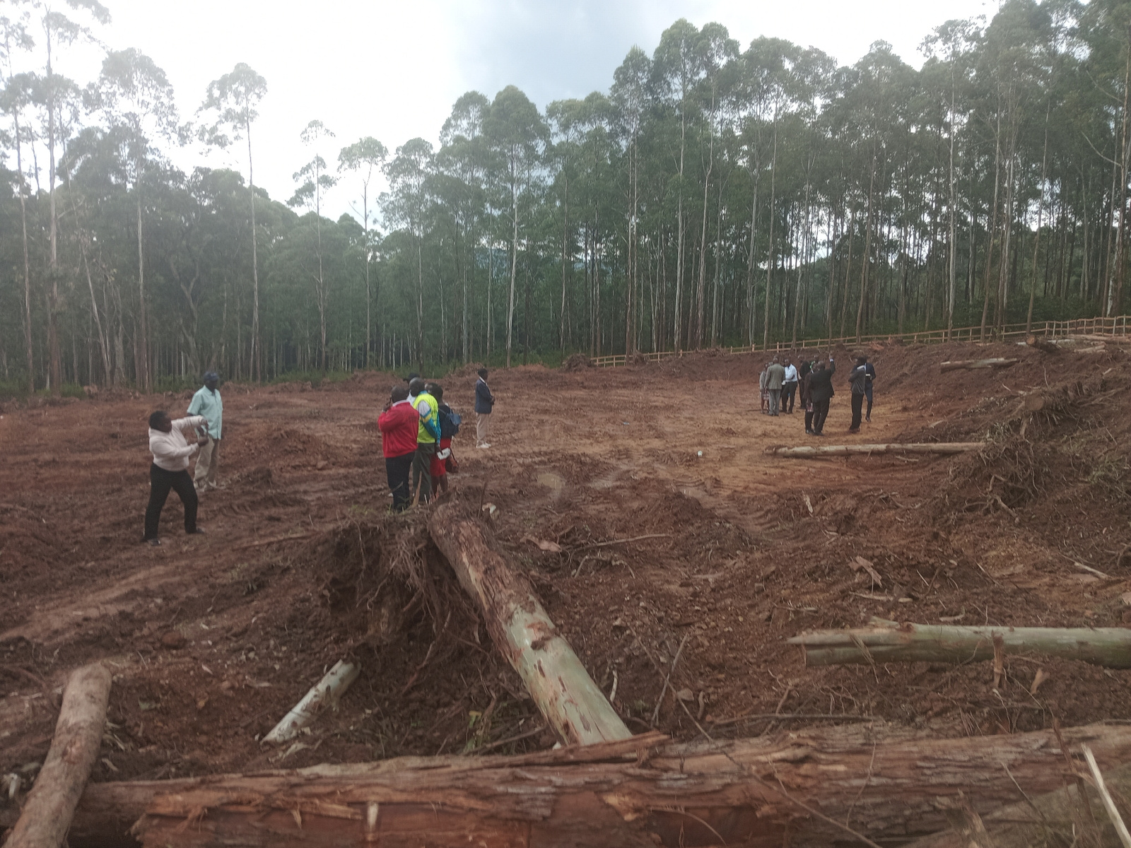 The image depicts a deforested area in Moticho Ward, Kenya. A group of people are standing on muddy, disturbed earth among felled logs and debris. Some people are wearing casual attire, others are dre…read more