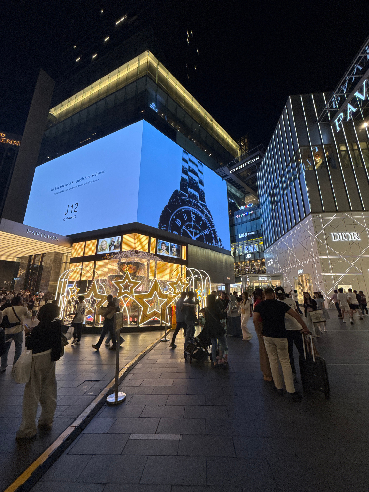 The image captures a street scene at night in Kuala Lumpur, Malaysia. The shot is taken from a low angle, highlighting the tall buildings and illuminated storefronts. On the left, a large digital bill…read more