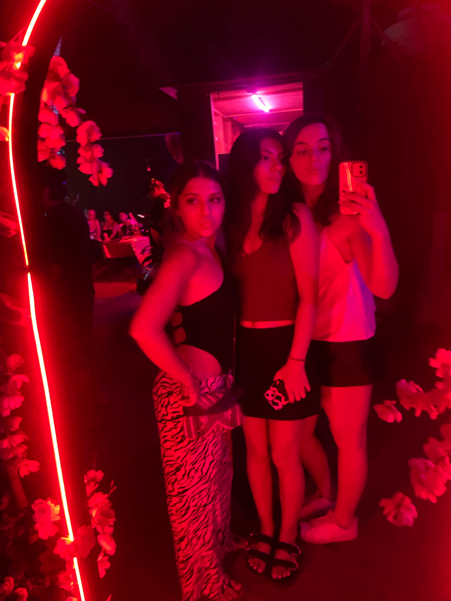 Three young women are lying down, possibly on a bench or low platform, with a red light illuminating the scene. They appear to be taking a selfie or posing for a photo, as they are holding up their ph…read more