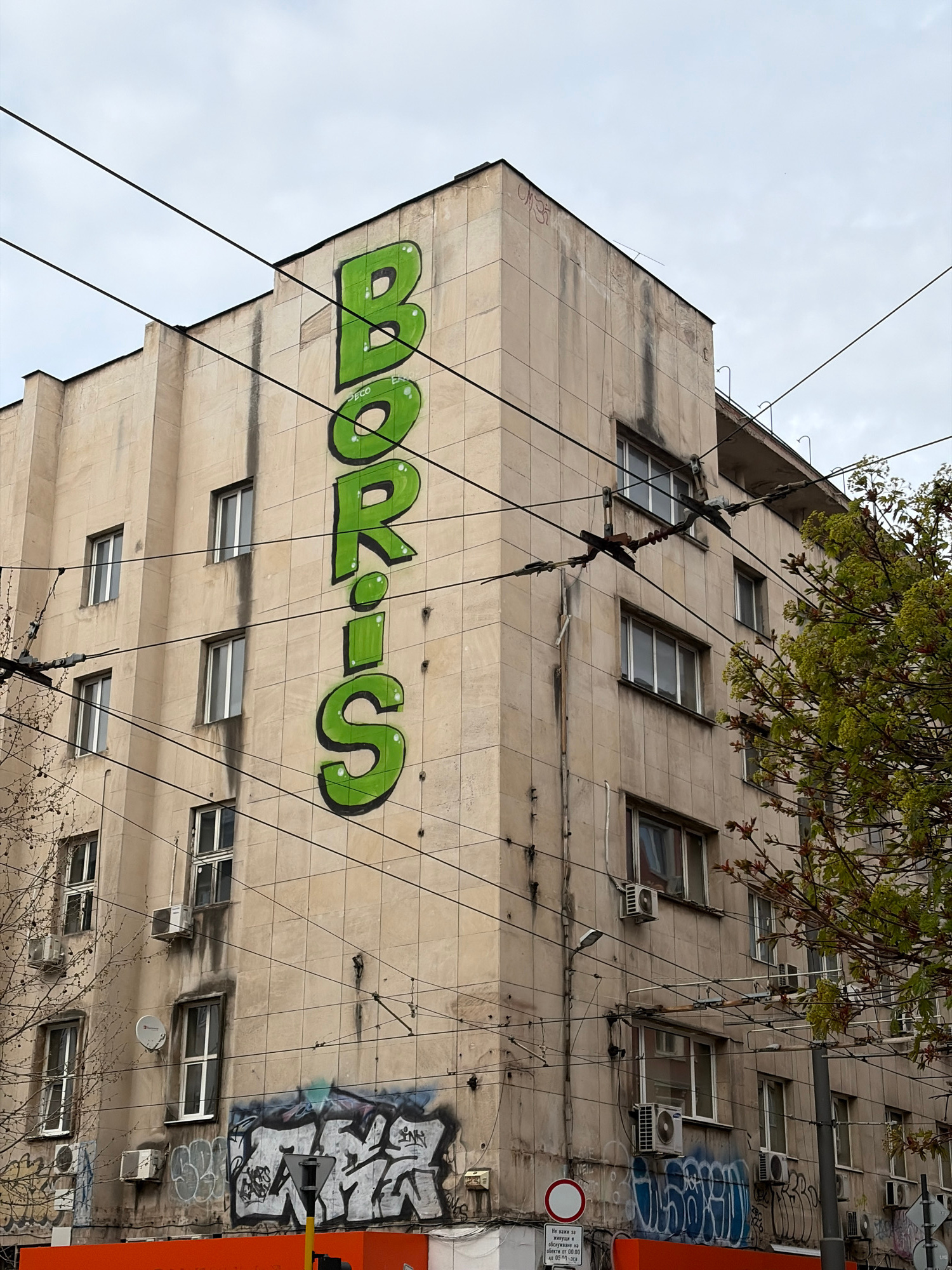 An urban scene in Sofia, Bulgaria, features a multi-story building facade with a worn, light-colored tiled or stone exterior, seen from a low-angle perspective. The camera is rotated clockwise, making…read more