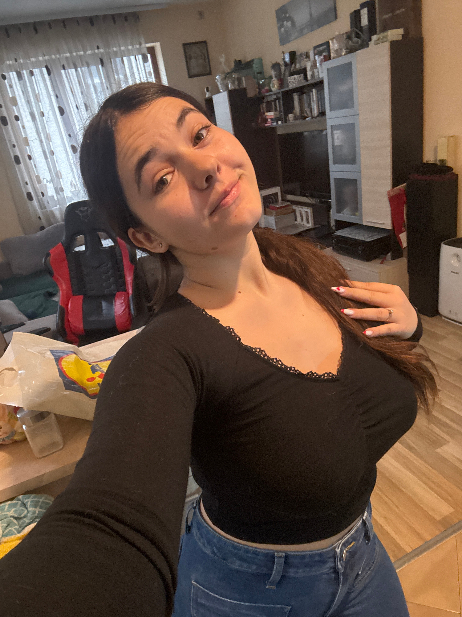 A young woman is depicted in a selfie, taken indoors and rotated 90 degrees clockwise. She has long, dark brown hair and dark eyes, looking directly at the camera with a neutral to slightly smiling ex…read more