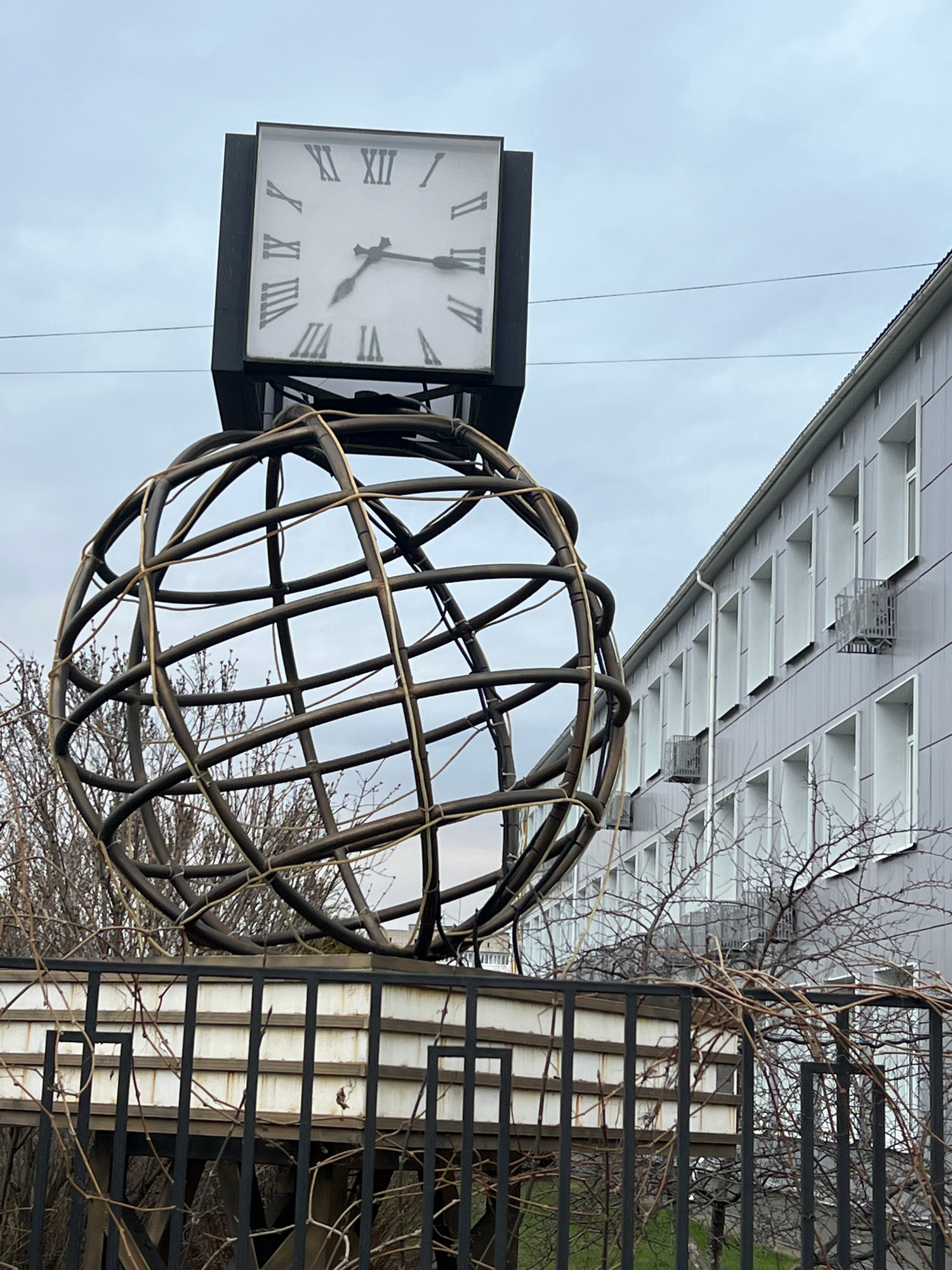 The image shows a view in Chaikovsky, Russia, featuring a clock and metal globe structure outdoors. The clock face is square with Roman numerals, displaying a time around 4:38. Adjacent to the clock iā¦read more