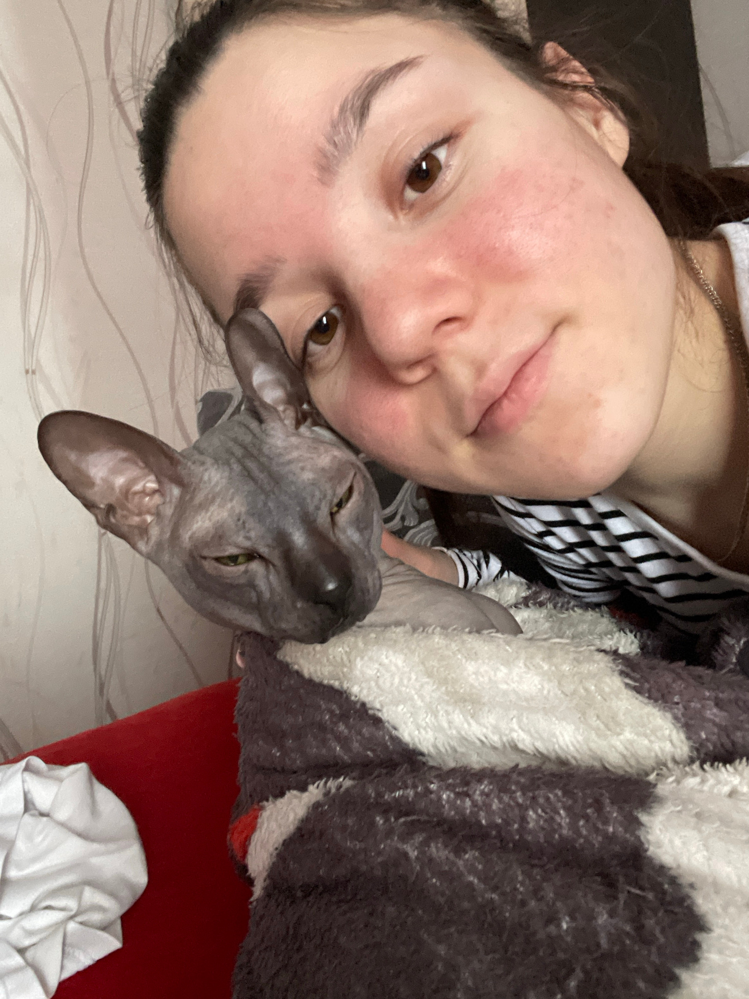 A selfie captured indoors depicts a young woman and a sphynx cat. The woman has fair skin, brown eyes, and dark hair. She is wearing a striped shirt. The cat, a hairless breed, has gray skin with wrin…read more