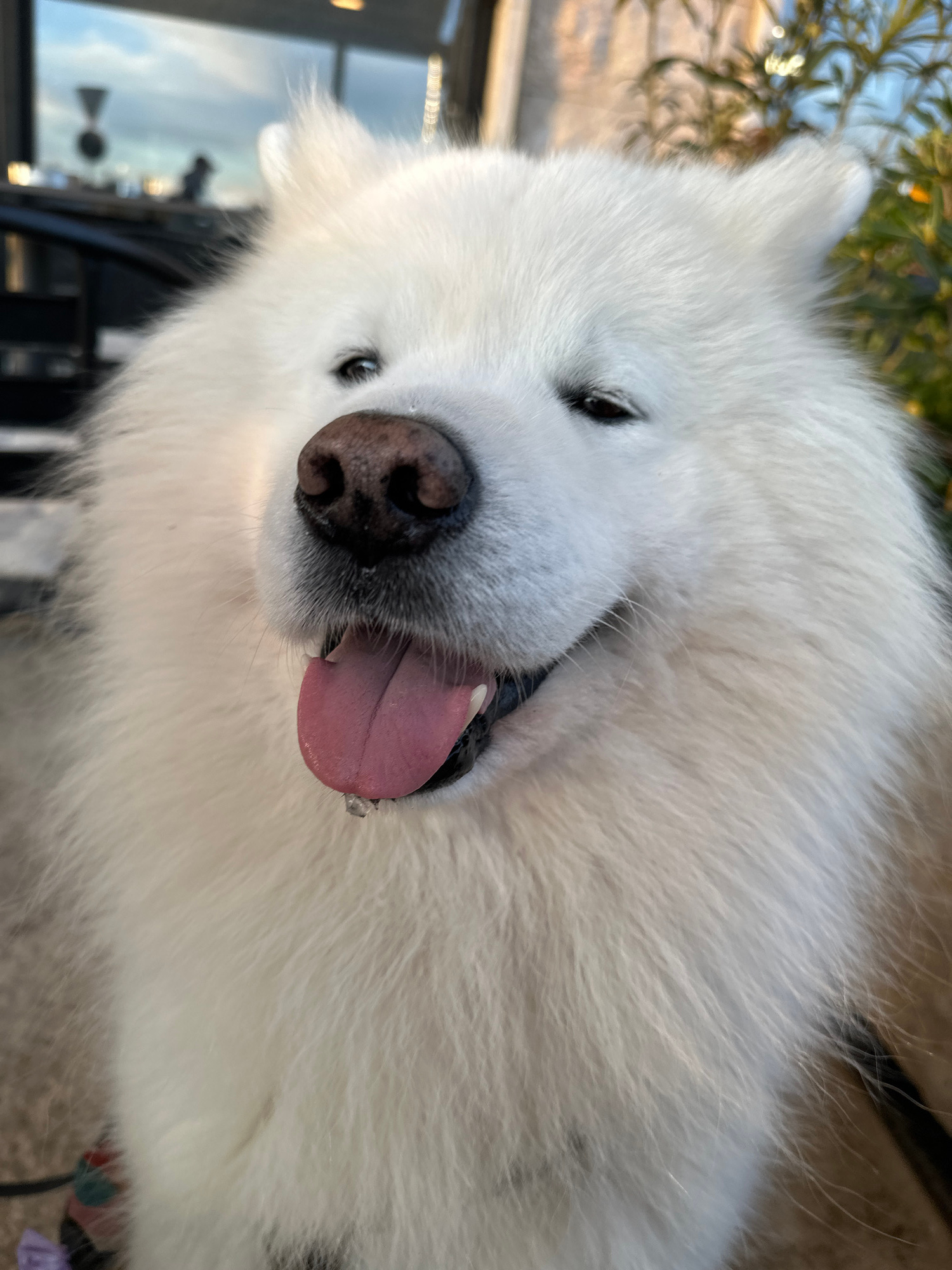 A close-up, slightly off-center portrait depicts a fluffy white dog, likely a Samoyed, with its tongue lolling out of its mouth. The dog's pink tongue is visible, contrasting with its black nose and d…read more