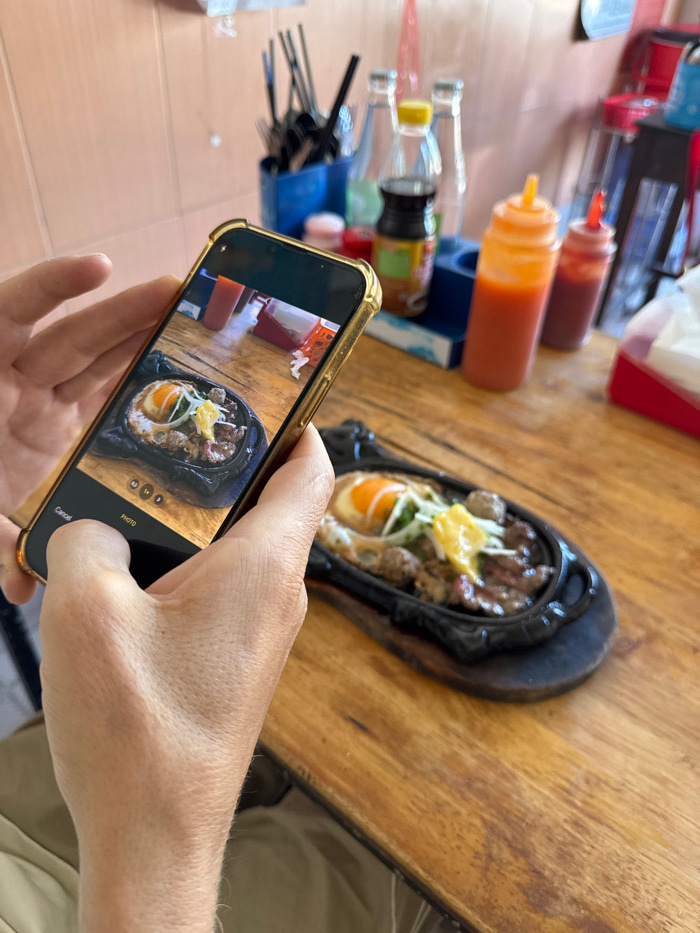 A person holds a gold-cased iPhone, displaying a picture of food in a black, oval serving dish. The food appears to include eggs, meat, and shredded toppings. The iPhone's camera interface is visible.…read more