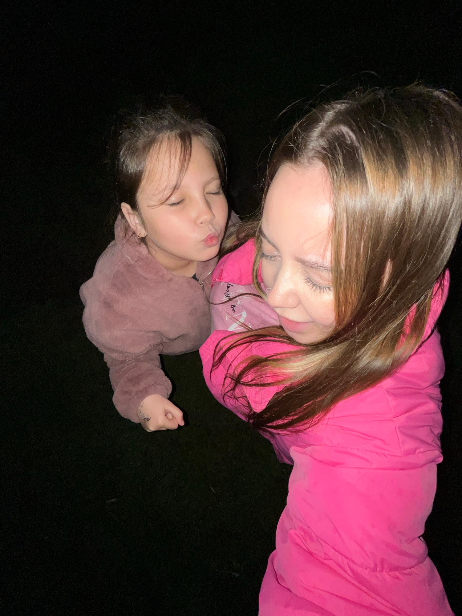 A young woman in a pink jacket is looking down at a young child wearing a mauve jacket. The child is lying on a dark surface, possibly grass. The location is unspecified and I cannot determine it is i…read more