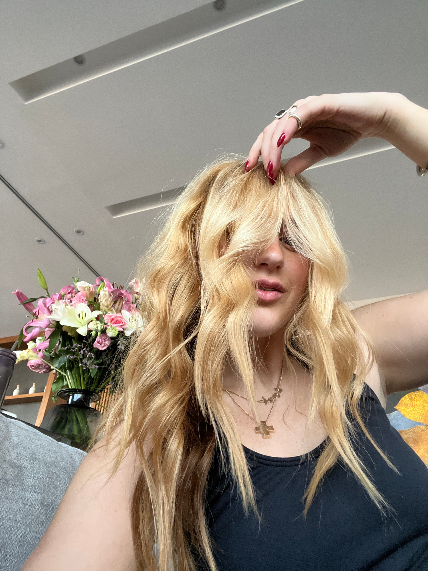 An indoor, close-up photograph captures a blonde-haired individual, presumed female, with wavy hair partially obscuring her face. Her left hand, featuring dark red manicured nails, is raised to her fo…read more