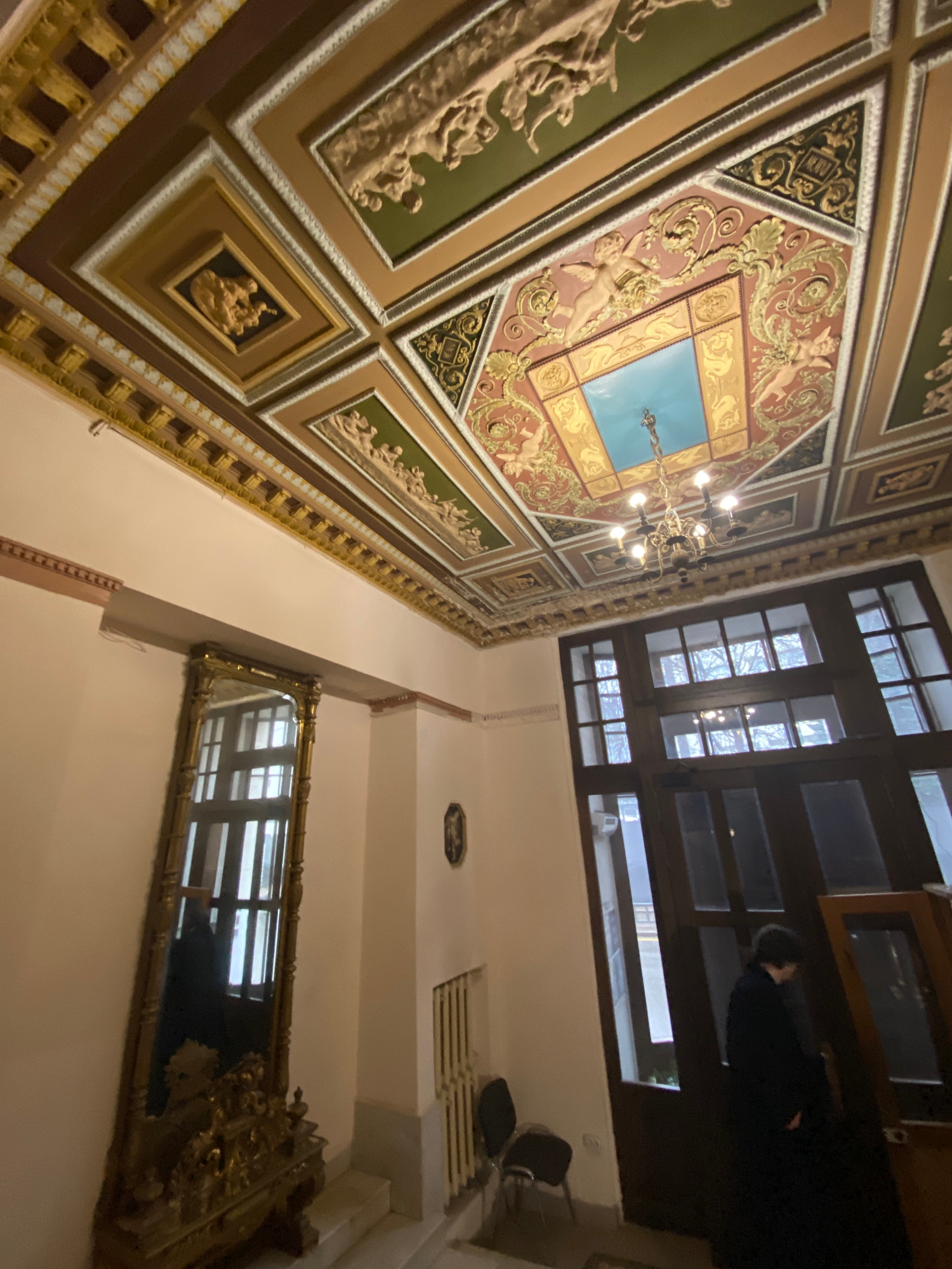 The image shows an interior view with a focus on an elaborately decorated ceiling, likely located in a historical building. The ceiling is ornamented with frescoes, relief sculptures, and gilded detai…read more