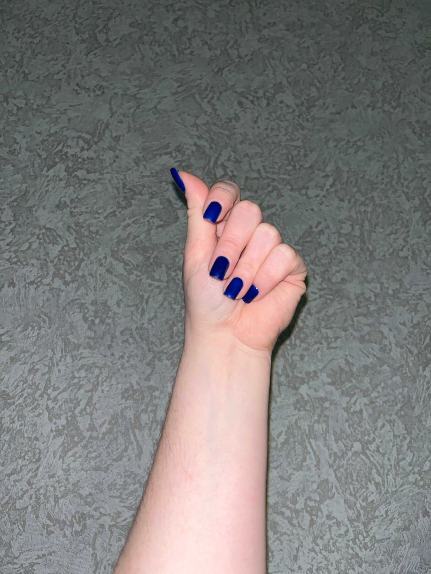 A pale-skinned left hand, with fingers partially clenched and thumb extended, rests against a textured gray background. The fingernails are painted a dark blue. The forearm extends towards the right o…read more