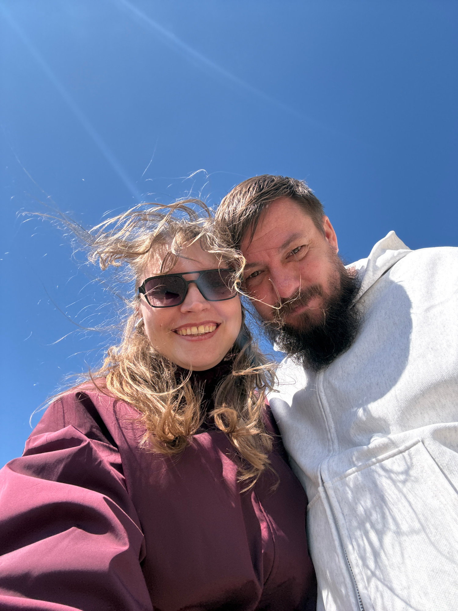 This media file is a selfie featuring a man and a woman, taken from a low angle looking up towards a clear, bright blue sky. The sky serves as the sole background, showing subtle sun streaks. The man…read more