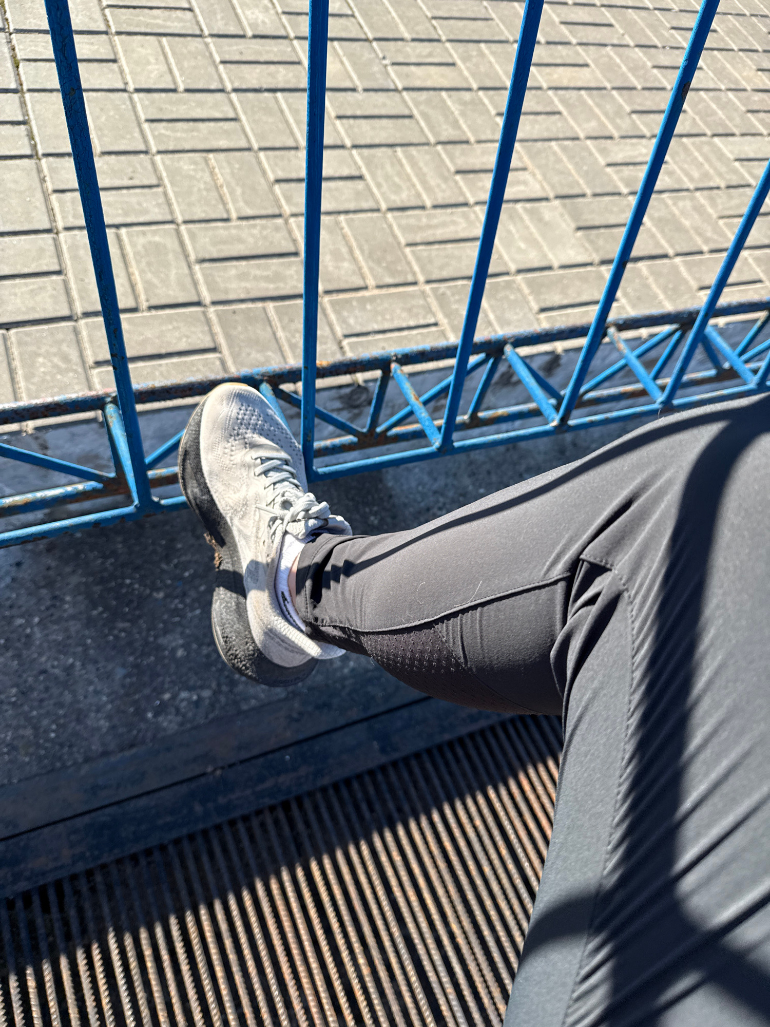 The image depicts a person standing on a metal grating. The person is wearing black athletic pants and a gray sneaker with a white sock. A blue metal railing is to the left, with a stone-block walkway…read more