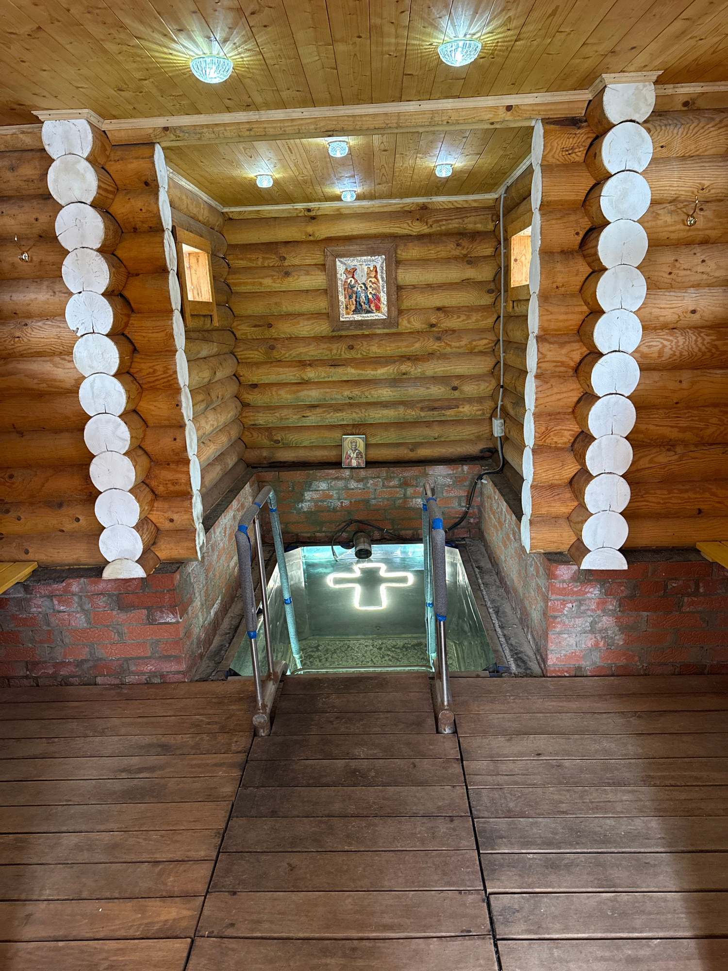 The image depicts the interior of a wooden structure in Karsha, Russia. The walls are constructed of logs, with decorative log ends painted white. A picture and religious icons adorn the walls. Spheri…read more