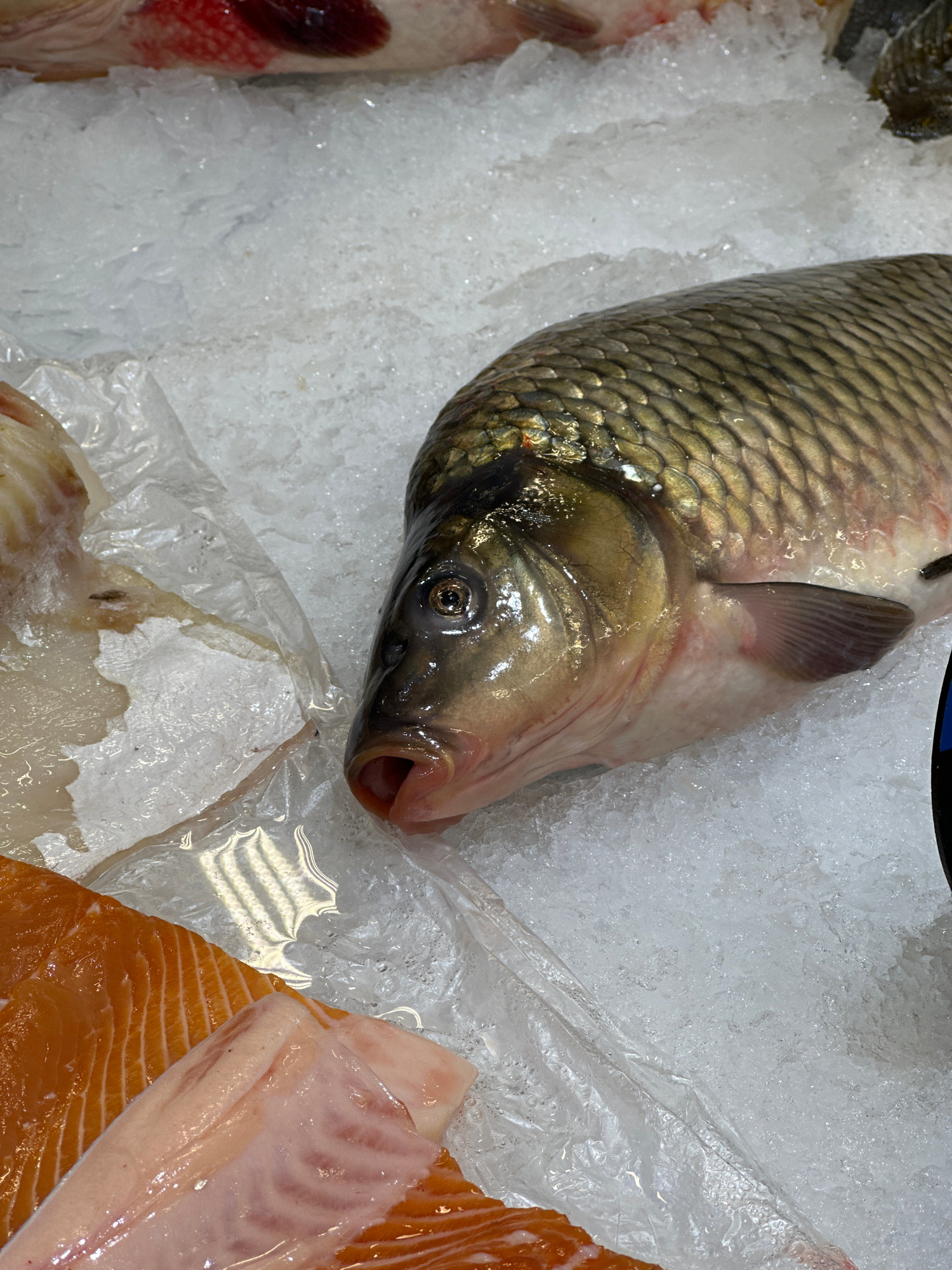 The image shows a close-up of a fish display, likely at a market or grocery store. The main subject is a whole, uncooked fish, potentially a carp, lying on a bed of crushed ice. Its scales are visible…read more