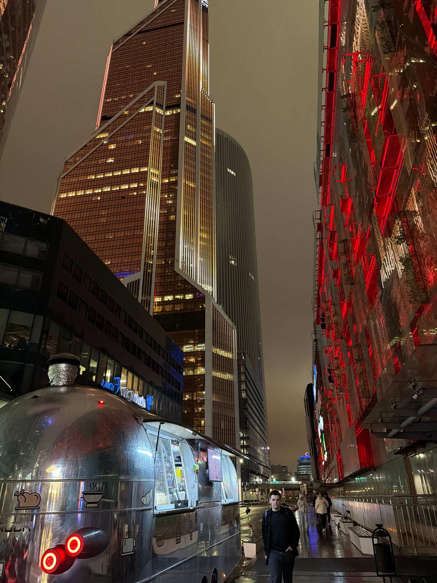 At night, the image depicts a street scene in Khimki, Russia. Dominating the view are tall, modern skyscrapers, illuminated with warm, golden lights from within, juxtaposed against a cloudy, dark sky.…read more