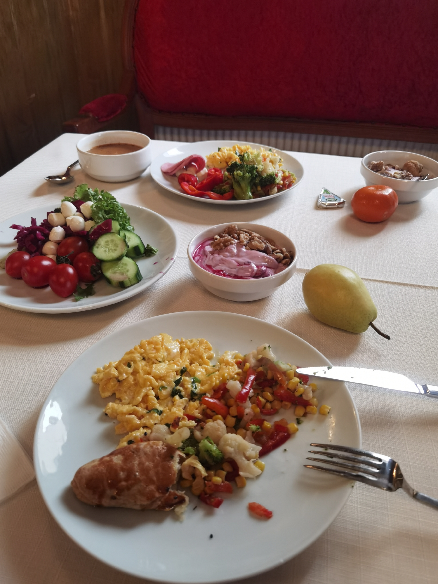 A hearty and colorful breakfast or brunch spread is meticulously arranged on a white tablecloth. No people are visible, but the meal is set for at least one person, with various dishes laid out. In t…read more