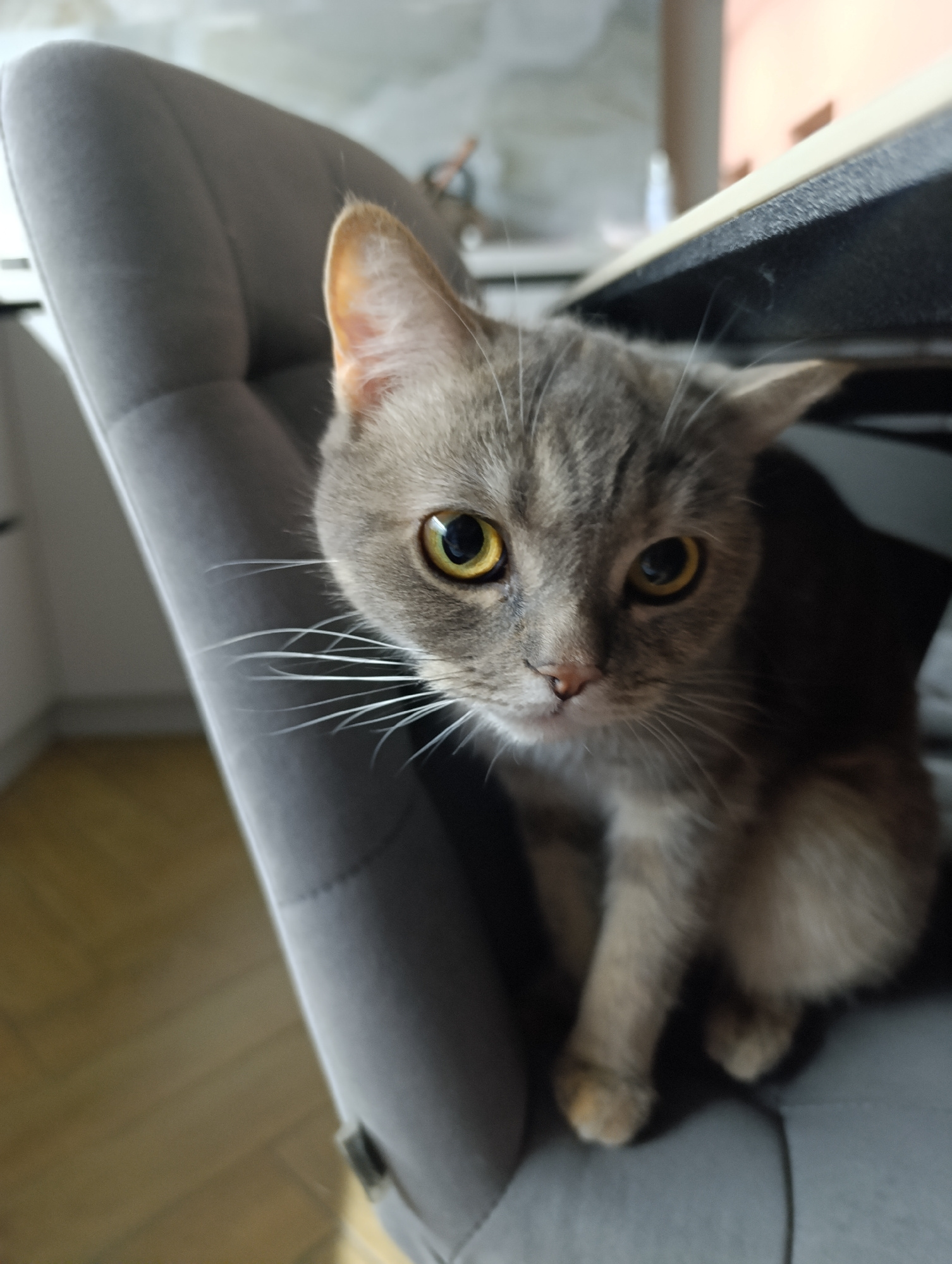 A gray tabby cat with yellow eyes sits on a gray upholstered chair. The cat is looking directly at the camera. Part of a desk is visible above the cat. The location is possibly a domestic interior in…read more