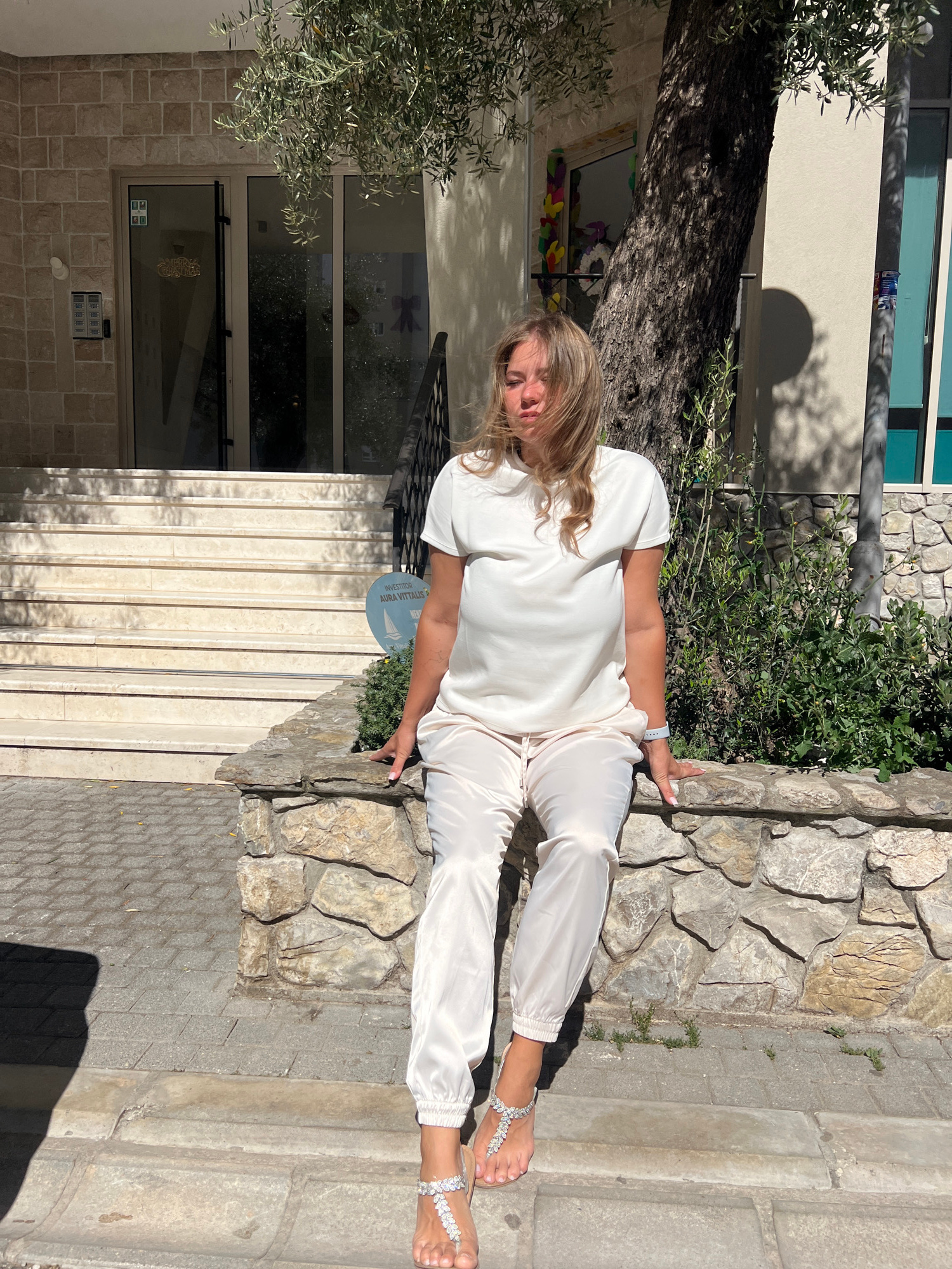 A woman is captured in a full-length, outdoor portrait, leaning casually against a textured stone wall. She has blonde hair and is wearing a matching light-colored (likely white or cream) short-sleeve…read more