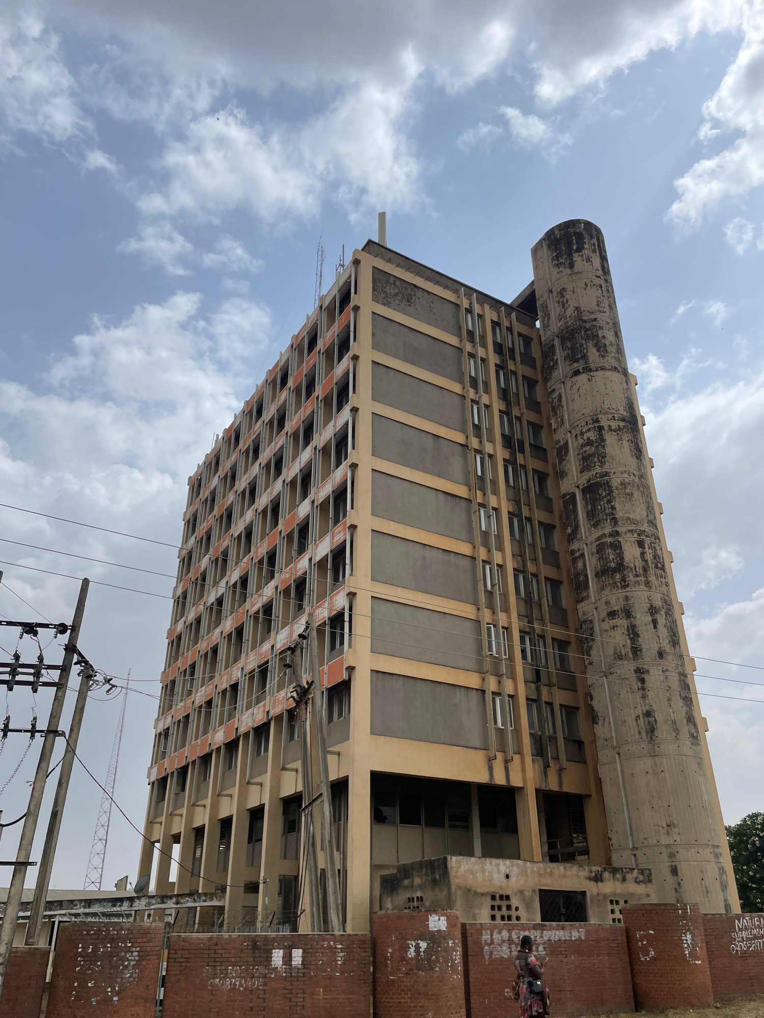 The image shows a tall, rectangular, multi-story building in Jos, Nigeria. The building has a large cylindrical structure on top of it. The building appears to be made of concrete and has a repetitive…read more