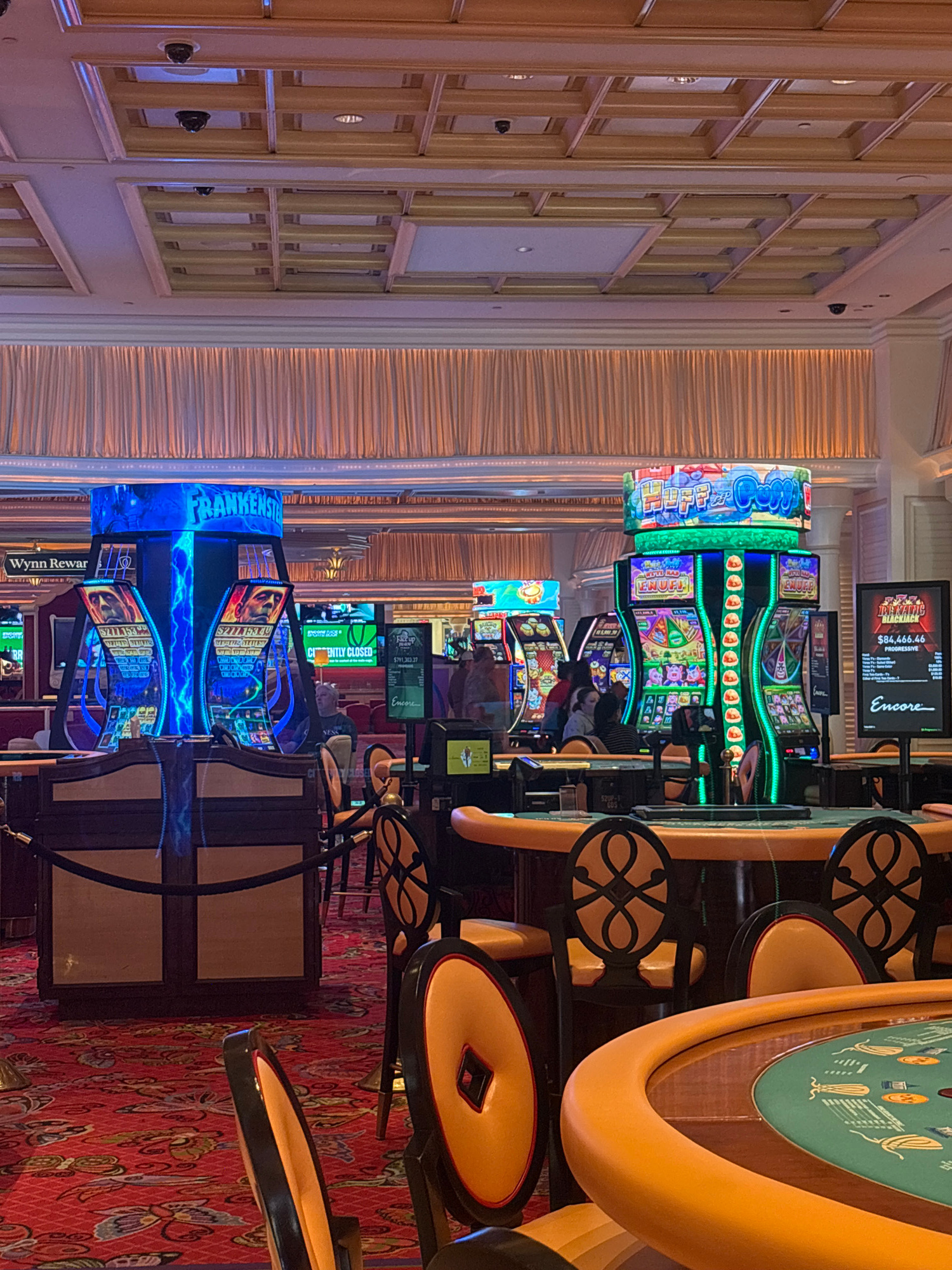 The image depicts the interior of a casino in Las Vegas, Nevada, United States of America. Slot machines, adorned with bright colors and titles such as "FRANKENSTEIN," "Wynn Rewards," and "Encore" are…read more