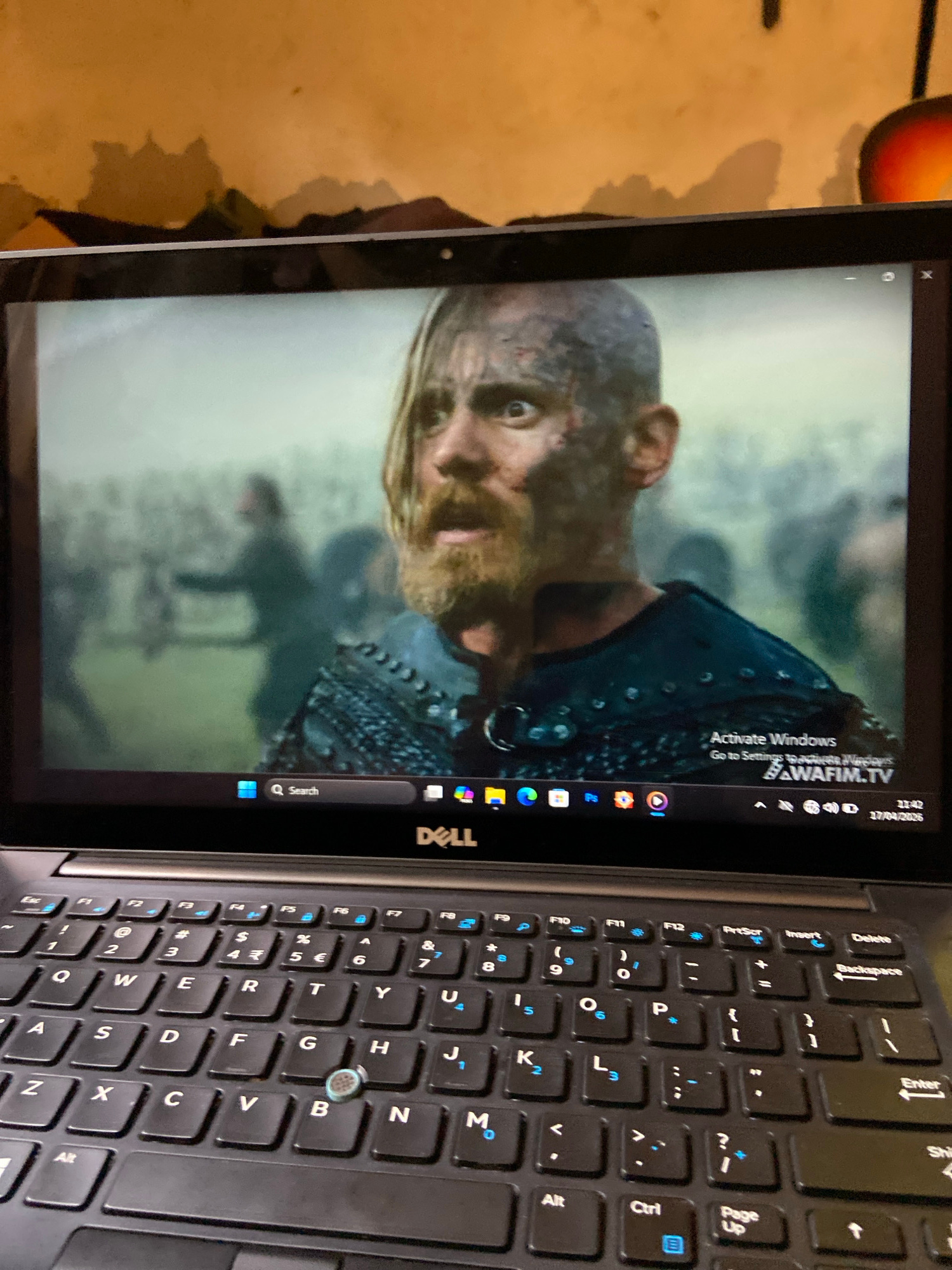 An image captures a Dell laptop with its screen displaying a video in a rotated orientation. The video shows a close-up of a fair-skinned man with a full beard, shaven head, and visible scars, looking…read more