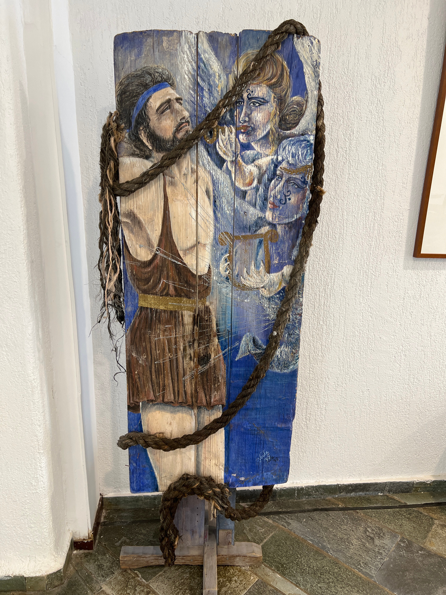 An artwork made from several horizontally arranged, distressed wooden planks is displayed, secured by a thick, dark brown rope woven around them. The planks are painted primarily in shades of blue, wh…read more