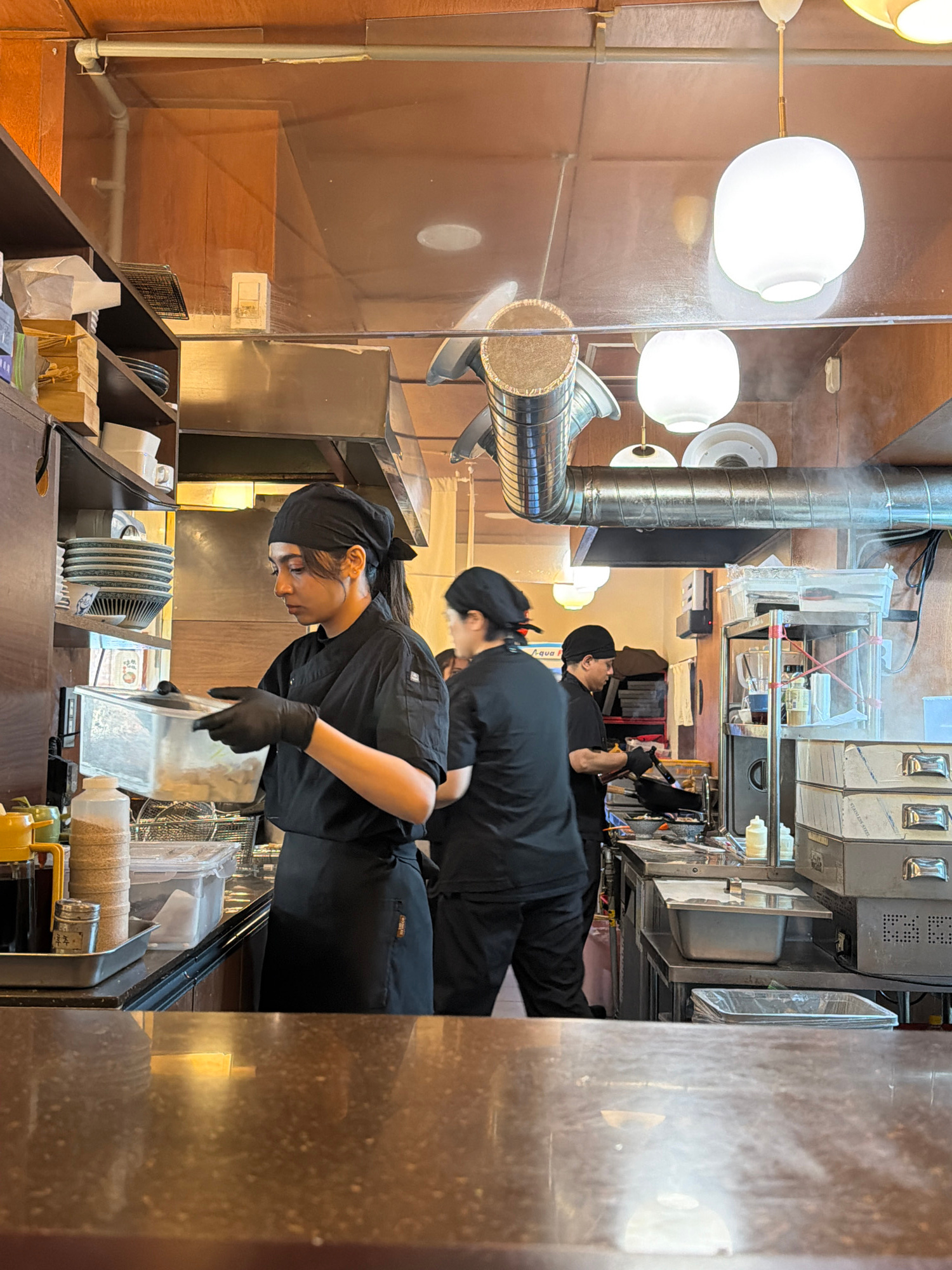 Inside a commercial kitchen, three individuals wearing black uniforms and head coverings are actively engaged in food preparation. The first person is focusing on a task at the front counter, while th…read more