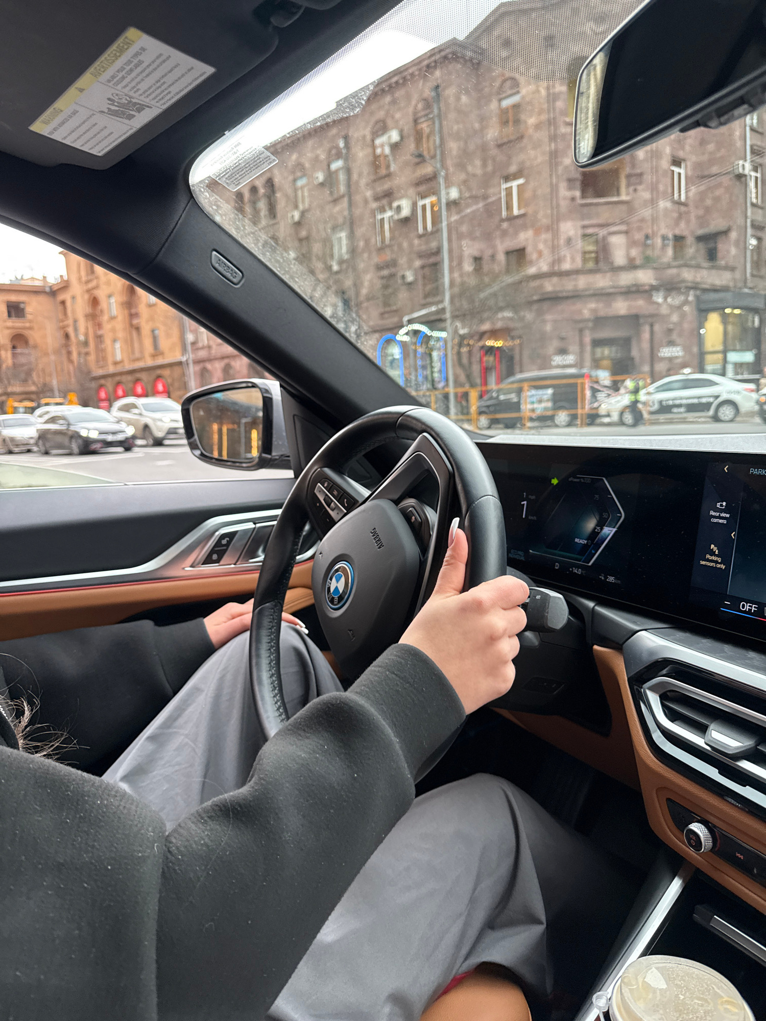 The interior of a car is captured, displaying a person’s hand gripping the steering wheel, marked with the BMW logo. The car features a digital dashboard with illuminated displays, as well as tan-colored accents along the dashboard. The driver wears a gray jacket. In the passenger area, a cup of liquid can be observed. Outside the windshield, a cityscape is visible, indicating an urban setting with densely packed buildings and parked vehicles. The urban environment suggests a location in the city of Yerevan, Armenia. | Open Wire
