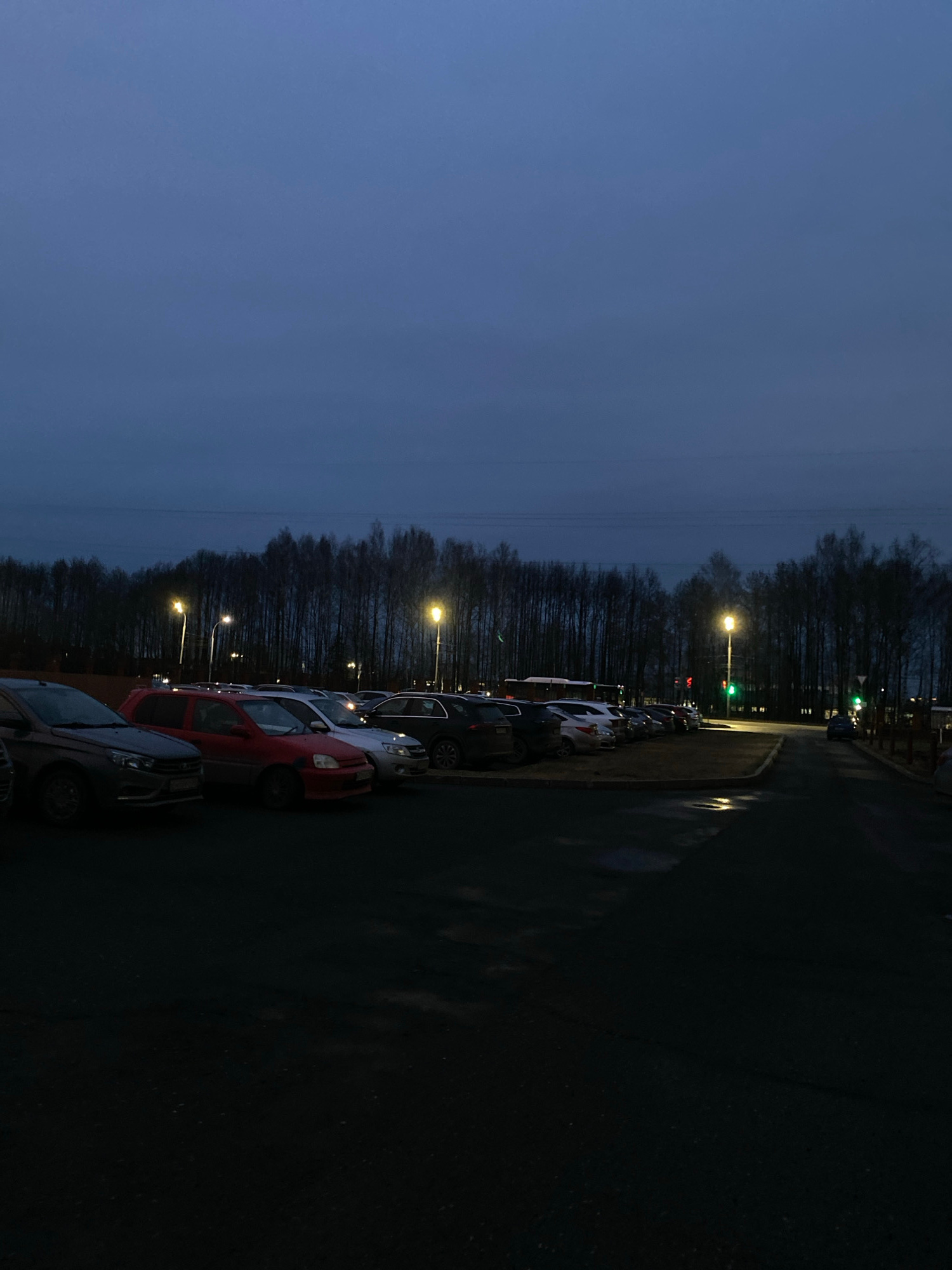 The image depicts a row of parked cars along a dark street, likely at dusk or dawn. The vehicles are parked on the right side of the frame, adjacent to a paved road with visible reflections, suggestin…read more