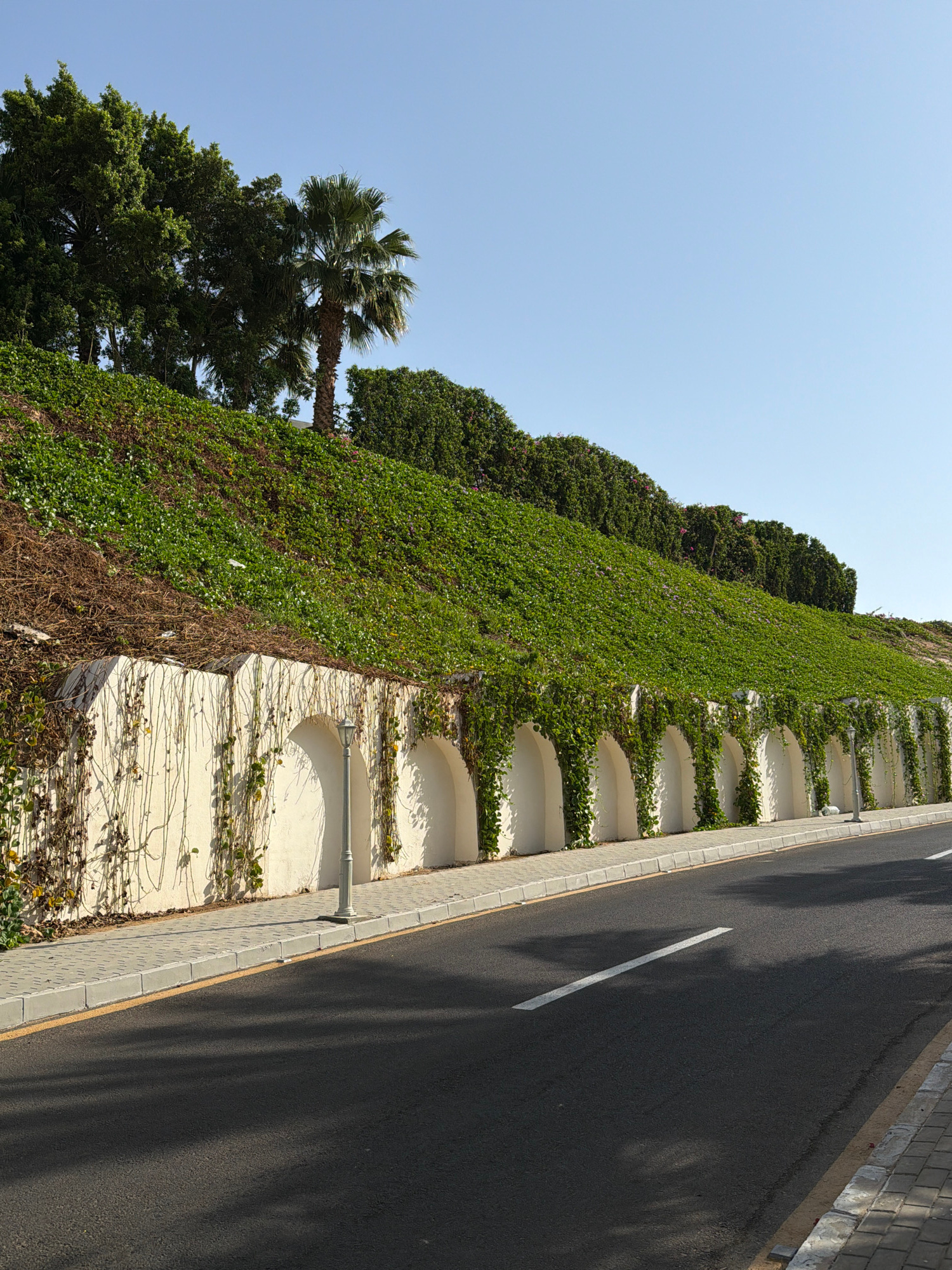 This outdoor daytime image captures a steep, verdant hillside bordering an asphalt road under a clear blue sky, set in Sharm El Sheikh, Egypt. On the right side, a dark asphalt road with a single whi…read more