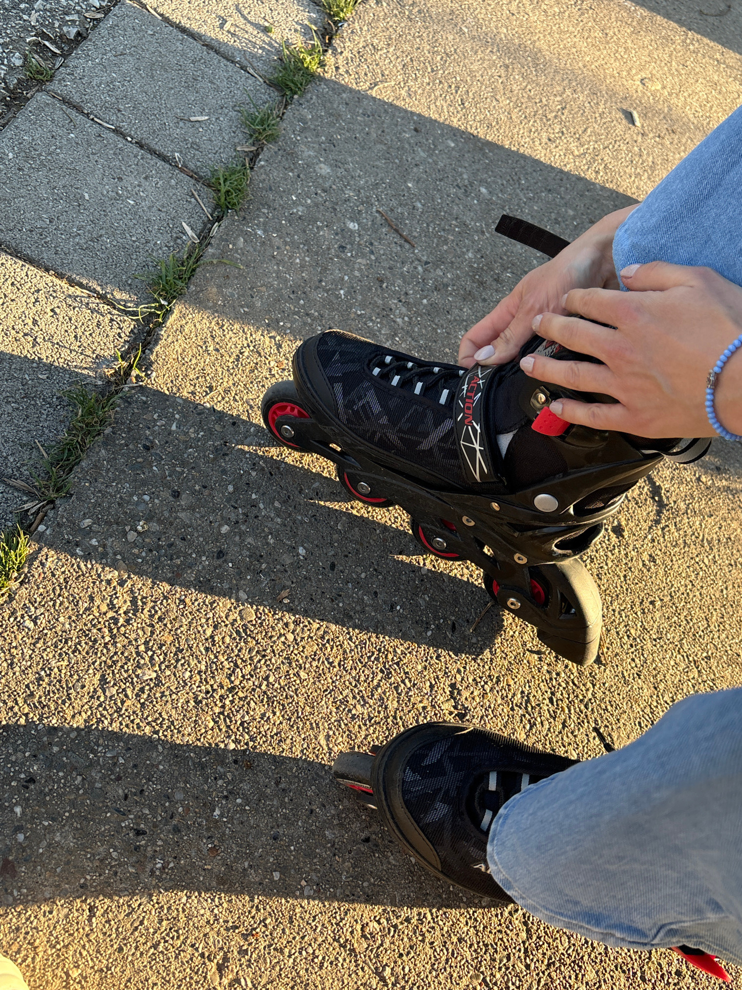 A person is shown putting on inline skates outside on a sunny day. The person is wearing light blue jeans and a beaded bracelet. The inline skates are black with red wheels. One skate is on and the pe…read more