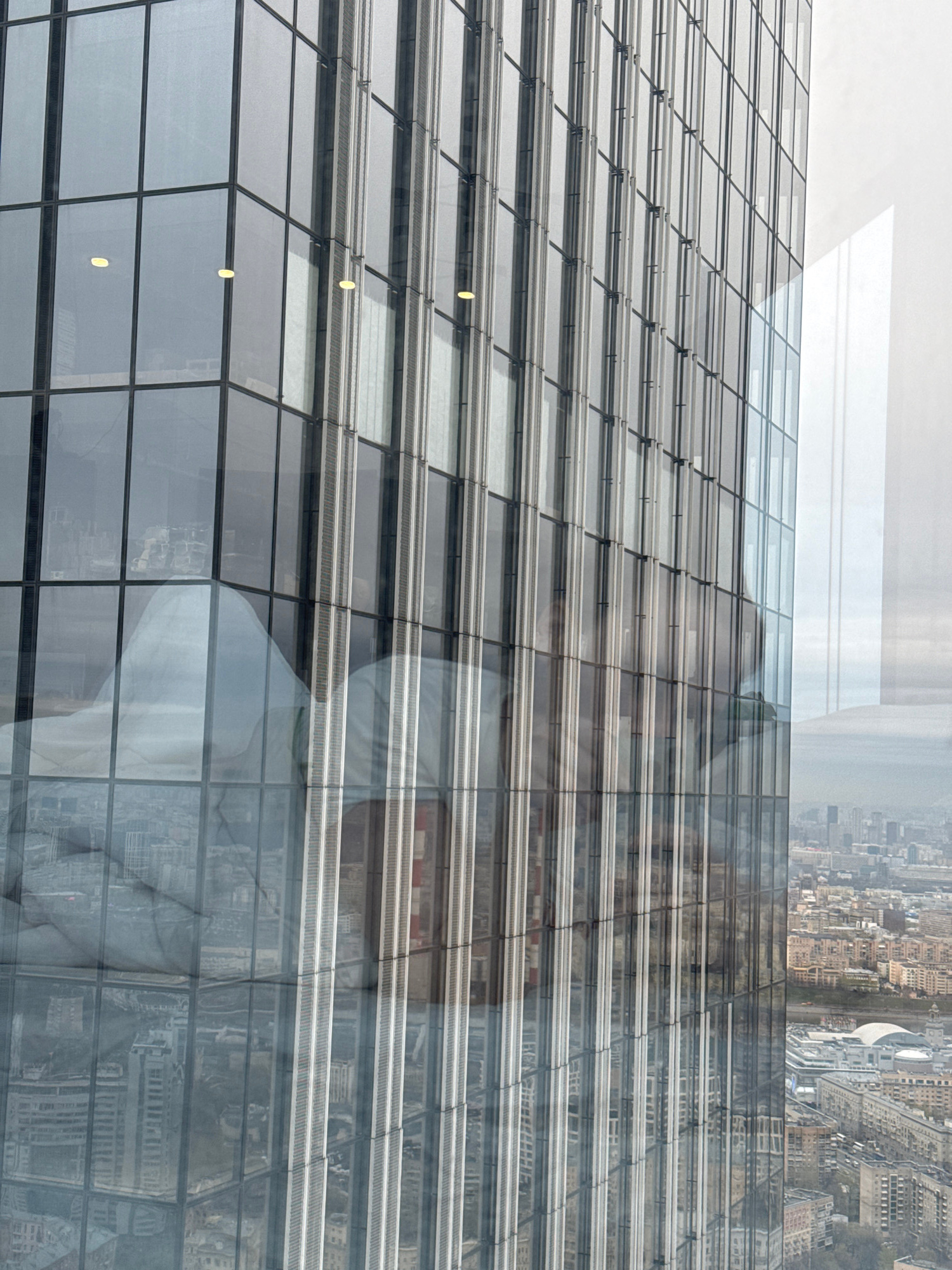 The image presents a view of a modern glass-clad building with a superimposed reflection of a cityscape, possibly including Khimki, Russia. The building's facade is characterized by a grid of square o…read more